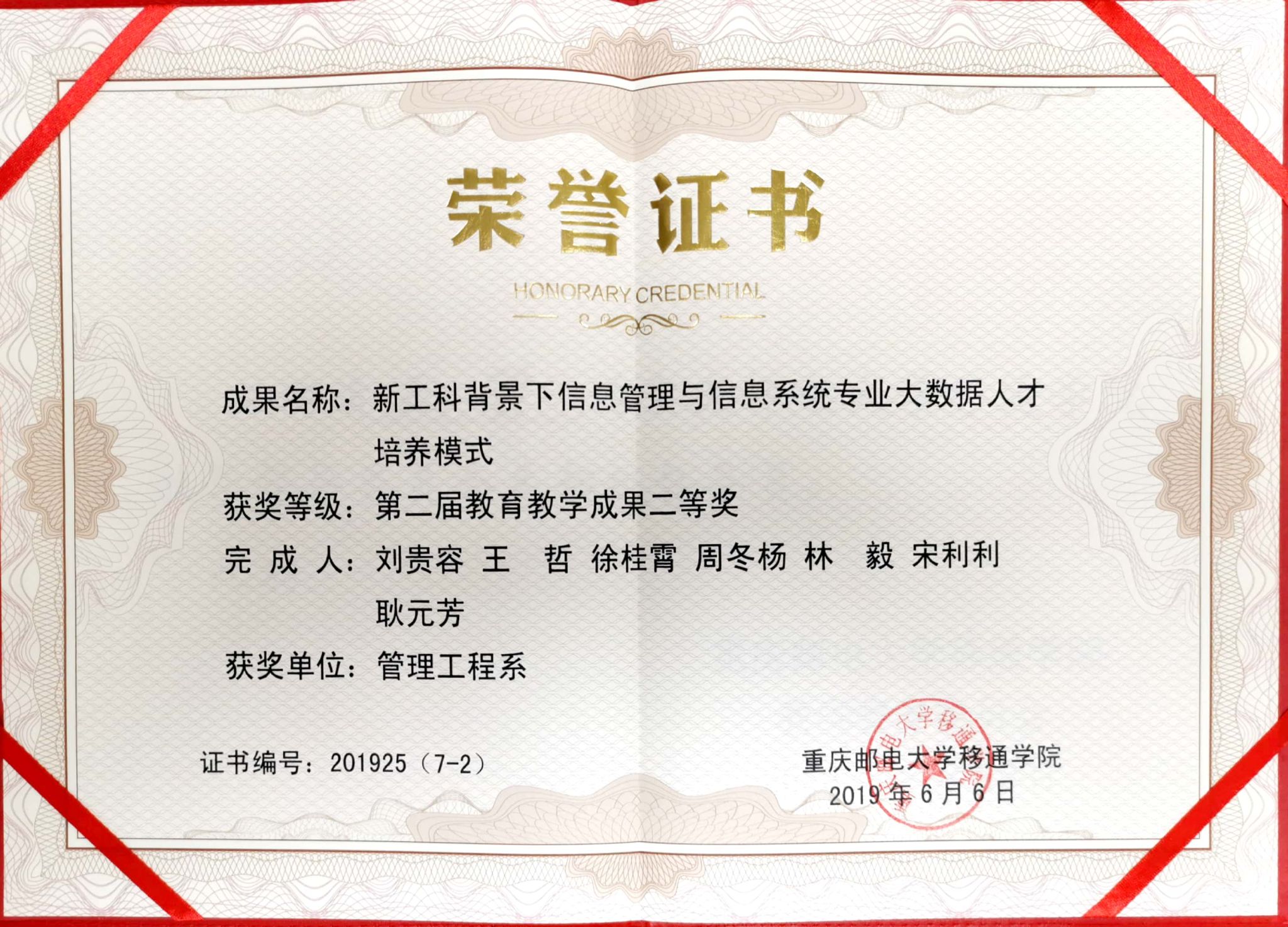 成果由刘贵容、王哲、徐桂霄、周冬杨、林毅、宋利利和耿元芳共同完成,隶属于管理工程系(后为数字经济与信息管理学院)。在2019年6月6日,荣获第二届教育教学成果二等奖,证书编号为201925(7-2)。成果名称“新工科背景下信息管理与信息系统专业大数据人才培养模式”响应新工科倡议,聚焦大数据人才培养模式改革。新工科强调工程教育与信息技术融合,成果涉及课程更新、师资培训或实验室建设,培养具备数据分析、系统开发能力的复合型人才。获奖等级二等奖(校级)表明其在校内影响力,证书编号201925(7-2)确保准确。完成人团队七位成员,体现早期合作,获奖单位管理工程系反映学院前身。背景上,2019年是新工科推进期,此成果为后续发展(如2023年特色专业结题)奠定基础,通过模式探索,提升专业竞争力。