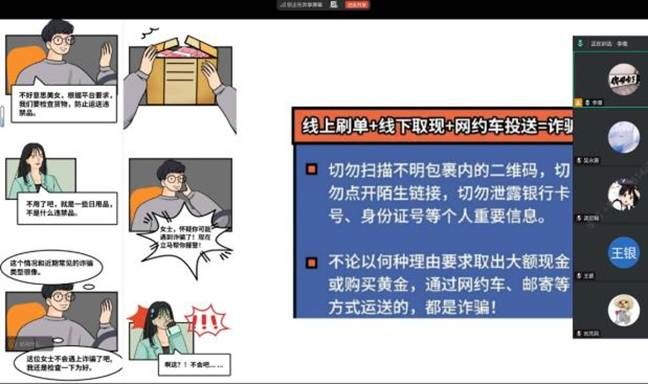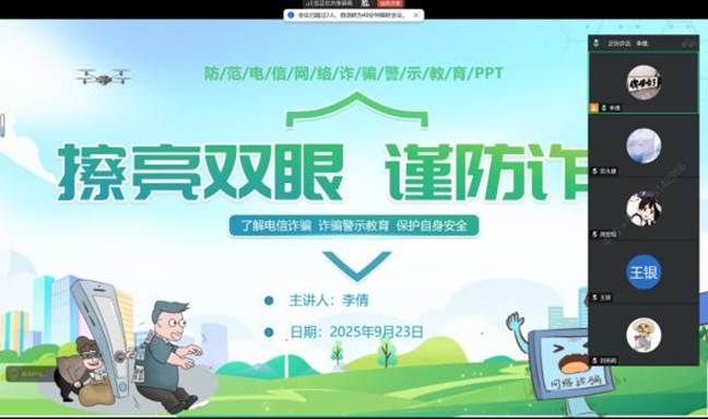 9月25日,田曌琪老师带领2025级工程管理2班的全体学生进行了谨防典型诈骗的线上会议,会议为同学们讲解了电信诈骗的主要内容和类型,通过有趣的小游戏让同学们记住如何防止电诈骗,学生们积极回答,叶蕊同学分享了生活中防骗的基本原则,同学们要树立很强的反诈意识;陈浩粮同学给大家普及了国家反诈中心APP和报警96110专线,普及反诈常识和预防电信诈骗的重要性。