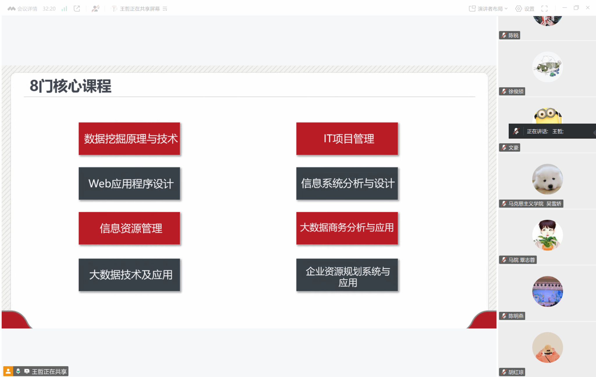 王院长在会上介绍了信息管理与信息系统专业的基本情况及课程思政编写工作的整体框架,编写团队选取了8门核心课程(数据挖掘原理与技术、Web应用程序设计、IT项目管理等)作为指南编写的主要内容。