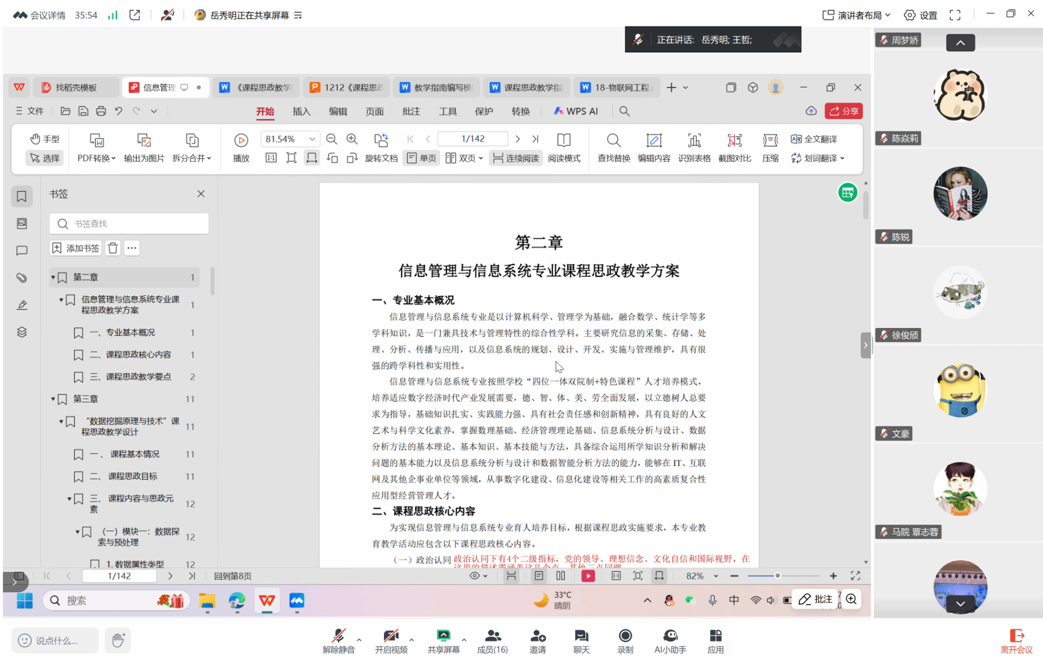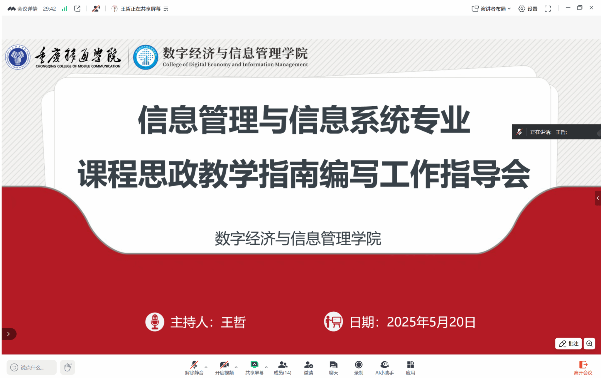 为深入贯彻落实立德树人根本任务,推动课程思政建设,2025年5月20日晚,我校数字经济与信息管理学院通过线上会议形式召开了“信息管理与信息系统专业课程思政教学指南编写工作指导会”。副院长王哲主持会议,邀请专家岳秀明教授进行指导,来自本专业及相关学院教师参会,共同探讨课程思政指南的编写思路与实施路径。