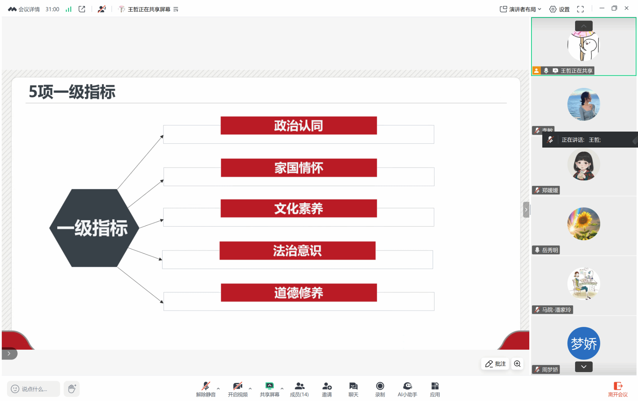 王院长强调,指南编写参照数字媒体技术等已有课程思政指南,采用五维一级指标(政治认同、家国情怀、文化素养、法治意识、道德修养)及20个二级指标体系,确保覆盖专业课程的核心育人目标。目前,编写团队已完成初稿并提交审阅,期待专家提出指导意见。