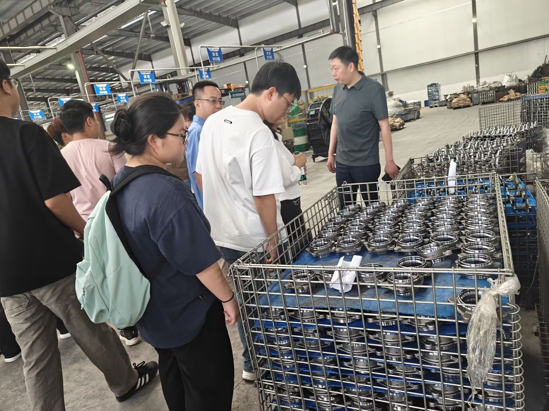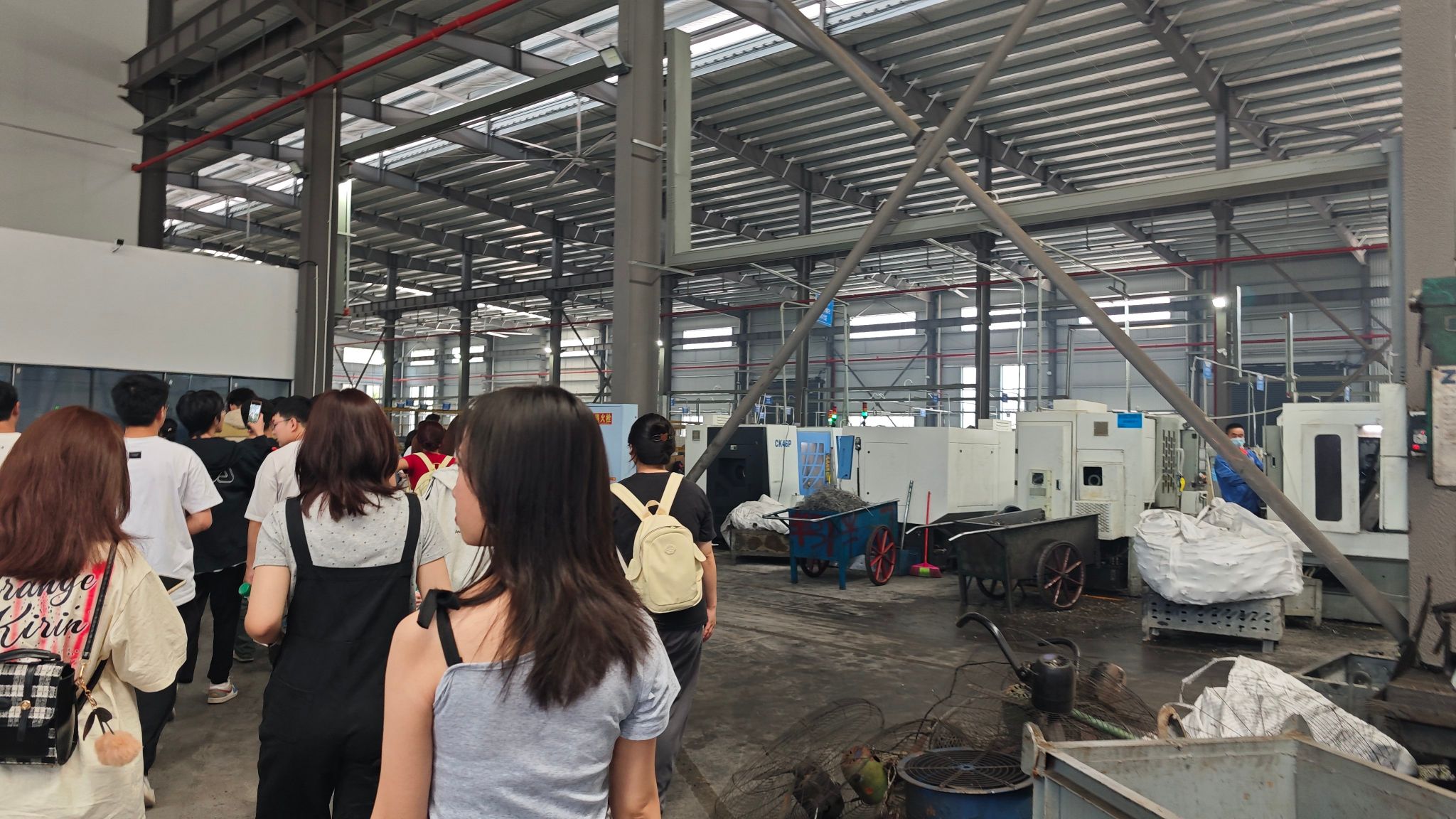 抵达企业后,同学们在工作人员的带领下深入生产车间,开启了一场沉浸式的工业探索之旅。车间内,现代化的生产场景令人印象深刻:机械臂精准抓取原材料,CNC加工中心以0.01毫米级精度雕琢零部件,检测区的光学仪器快速扫描并剔除瑕疵品。工作人员详细介绍了企业拥有的百余台精密设备及先进检测体系,并讲解了从齿轮、齿圈到传动轴等产品的数十道生产工序。同学们通过近距离观察自动化生产线的运作,触摸精密加工的零部件,深刻体会到了“智能制造”背后的技术沉淀与质量管控逻辑。