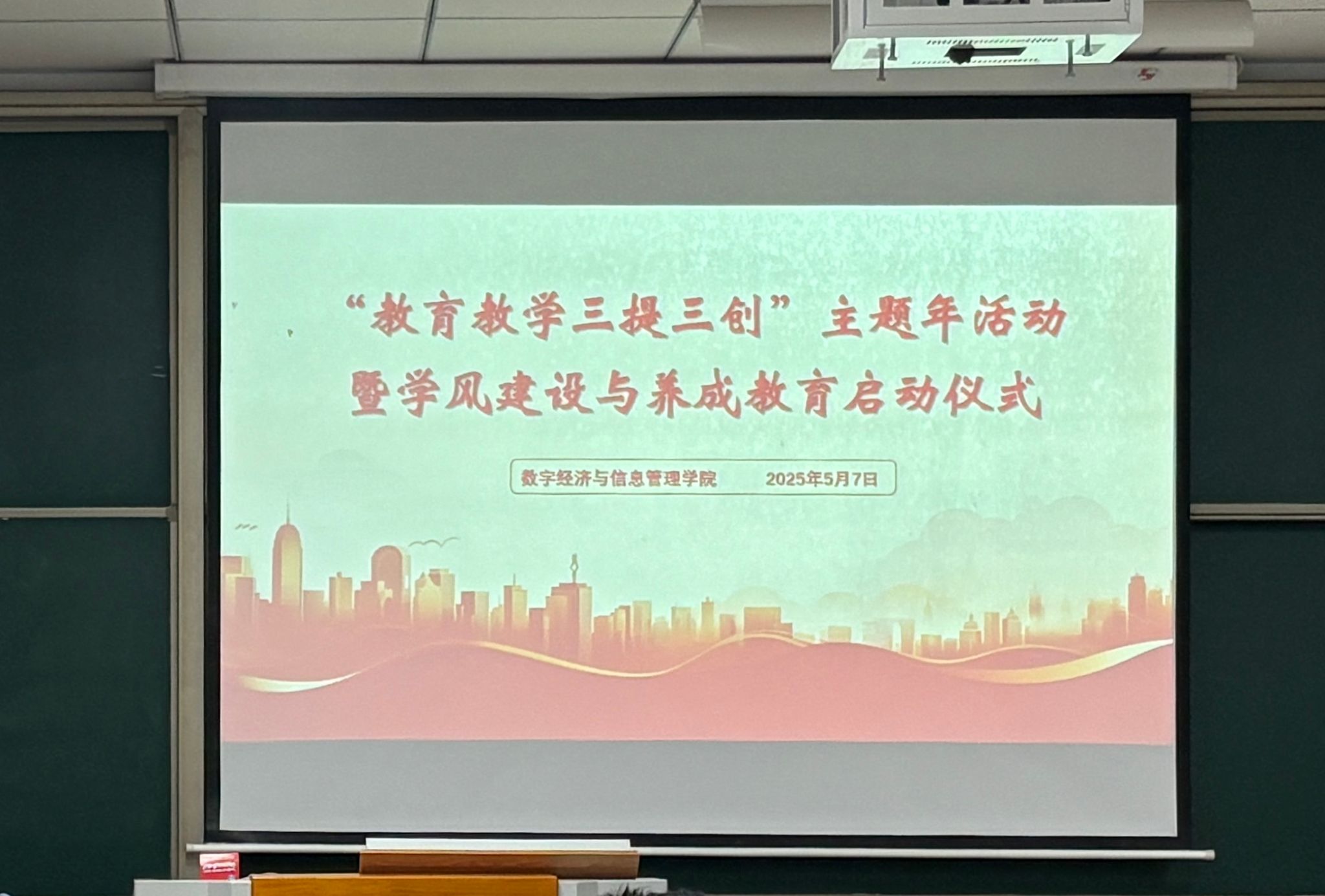 为进一步加强学院教育教学质量,增强学生“愿学”的主体意识,激发学生“好学”的内生动力,根据学校相关文件精神及实际情况,数字经济与信息管理学院于2025年5月7日16:00在仁者楼412教室举行了2025年“教育教学三提三创”—主题年活动暨学风建设养成教育启动仪式。学院全体教职工以及学生代表聚集在此,共同开启学院教育教学改革与学风建设的新篇章。本次活动由刘贵容院长主持。