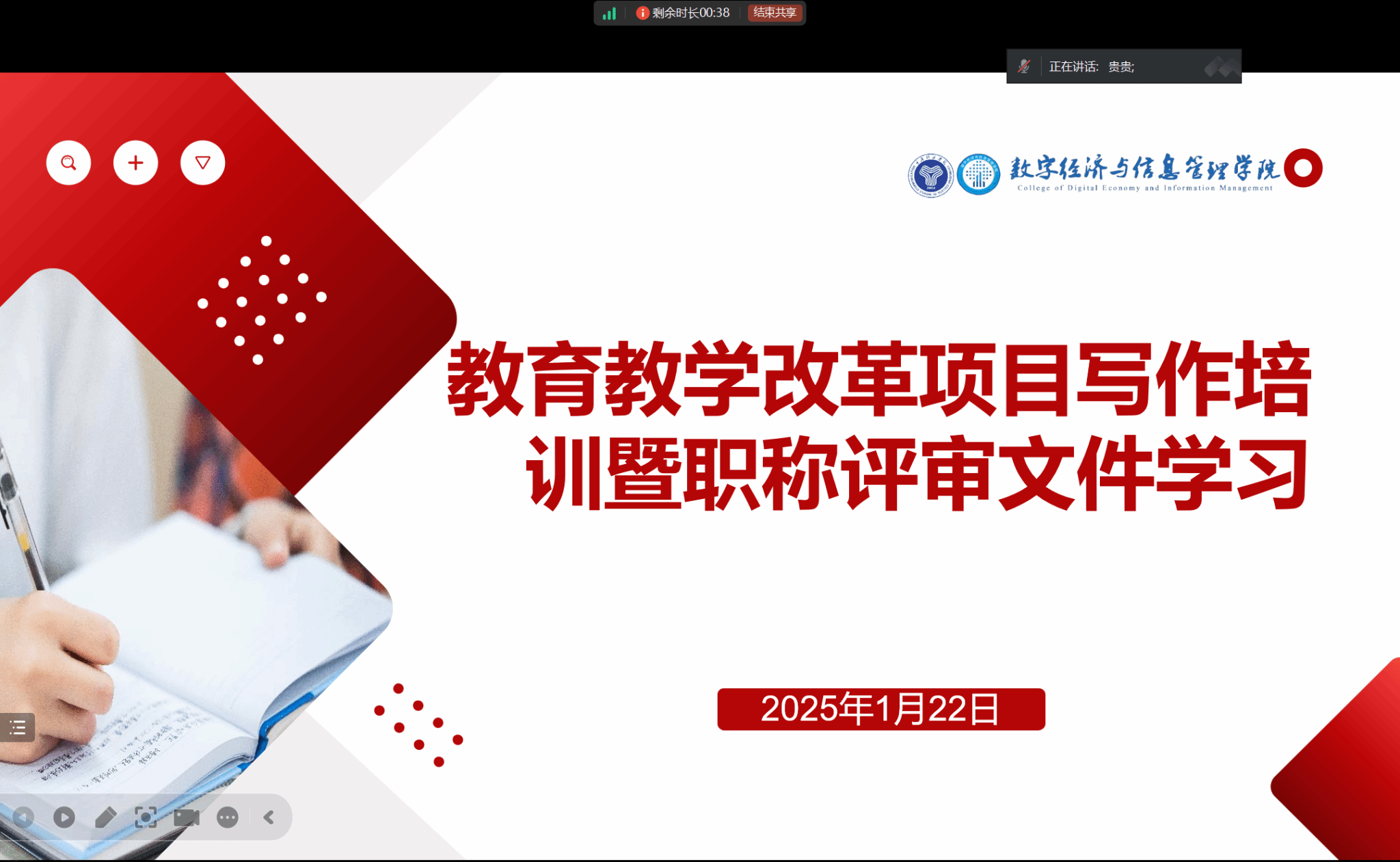 2025年1月22日,数字经济与信息管理学院开展了教育教学改革项目写作培训暨职称评审文件学习会议。此次会议旨在提升学院教师的教学改革项目申报能力,并深入理解职称评审的相关政策,为教师的职业发展提供有力支持。会议由数字经济与信息管理学院院长刘贵容主持,学院相关教师及辅导员积极参与。