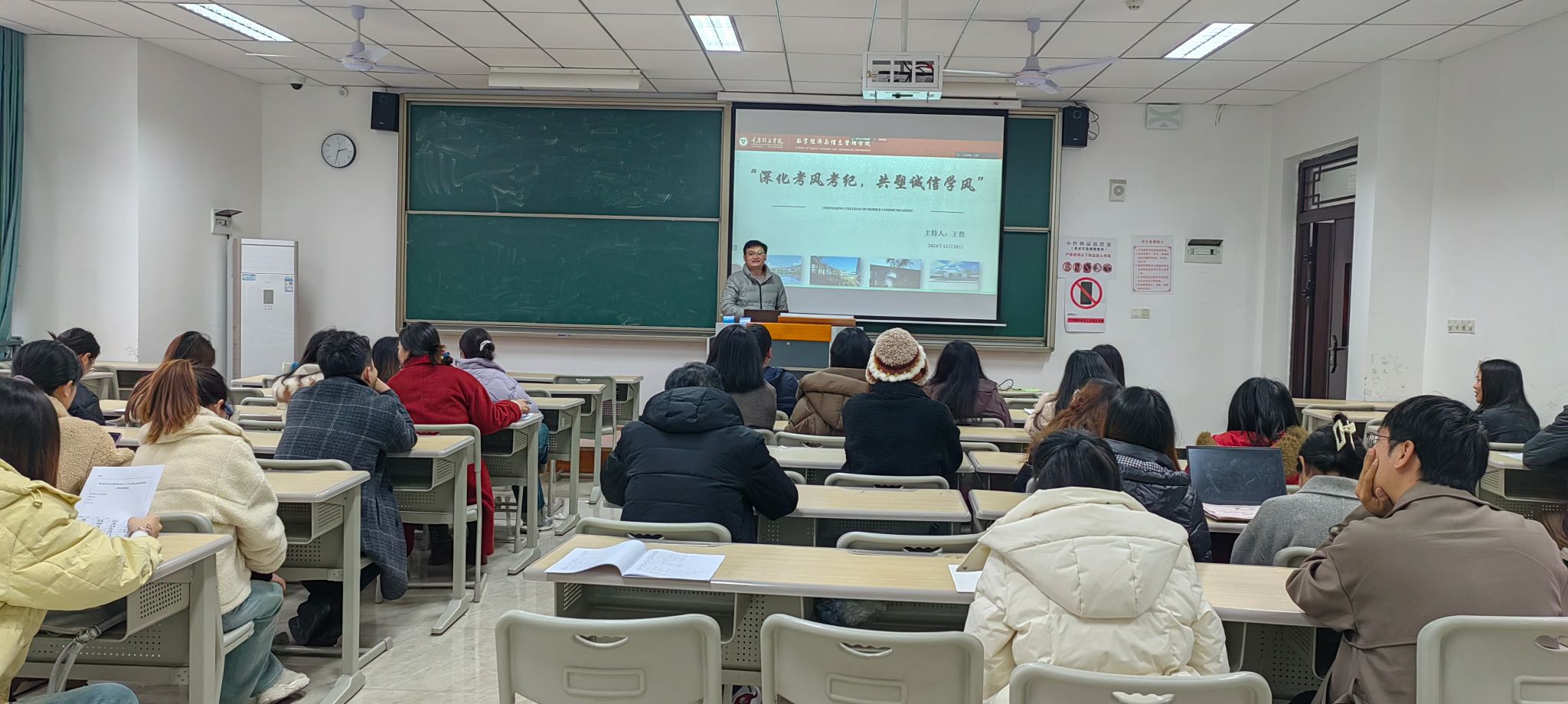 为进一步加强学院学风建设,严明考试纪律,增强学生诚信应考的意识,重庆移通学院数字经济与信息管理学院(以下简称“数信学院”)于2024年12月20日下午两点,在仁者楼403教室召开了以“深化考风考纪,共塑诚信学风”为主题的专题会议。