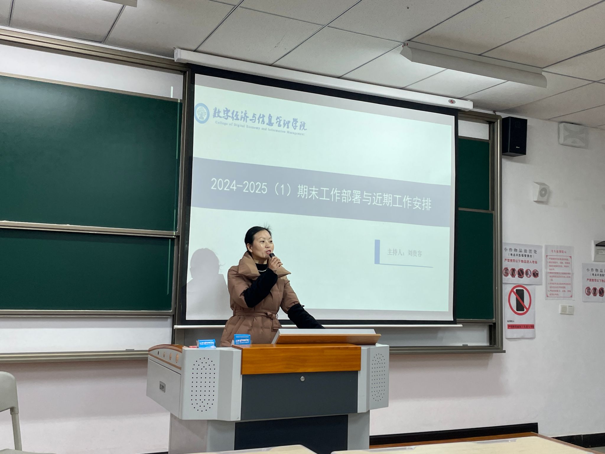 接着,数字经济与信息管理学院刘贵容院长进行了补充与总结发言,以期末工作部署与近期工作安排展开。教师团体不仅要按学校教务处要求做好期末工作,还要重视人培方案,明确目标,优化课程。对于下学期工作要求各学科组加强研讨与设计,精准把握教学重点难点,助力学生巩固知识、提升能力;学生安全教育更是重中之重,强调各辅导员需密切关注学生动态,通过多种形式开展安全教育活动,为学生营造安全、稳定的期末学习环境。