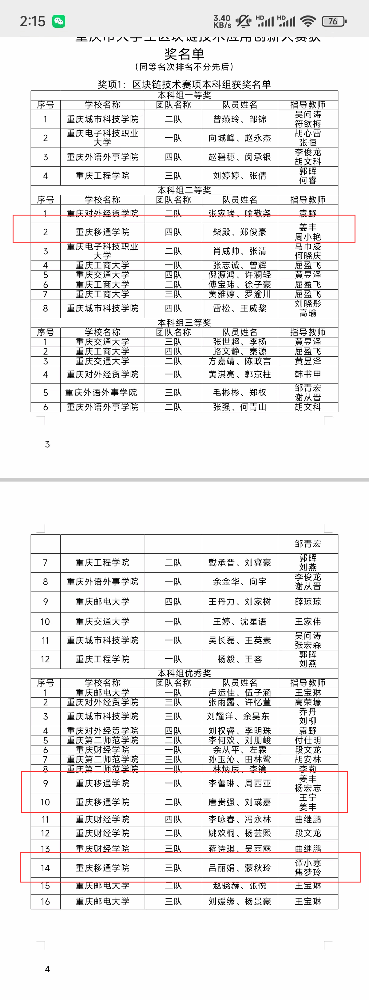 2024年11月8日至9日,重庆市大学生区块链技术应用创新大赛在重庆城市科技学院巴南校区成功举办。重庆移通学院派出16名通过校内选拔的选手参赛,在张菡、徐浪和姜丰三位指导老师的带领下,团队共获得一等奖1项(应用组)、二等奖1项(技术组)及优秀奖6项。
