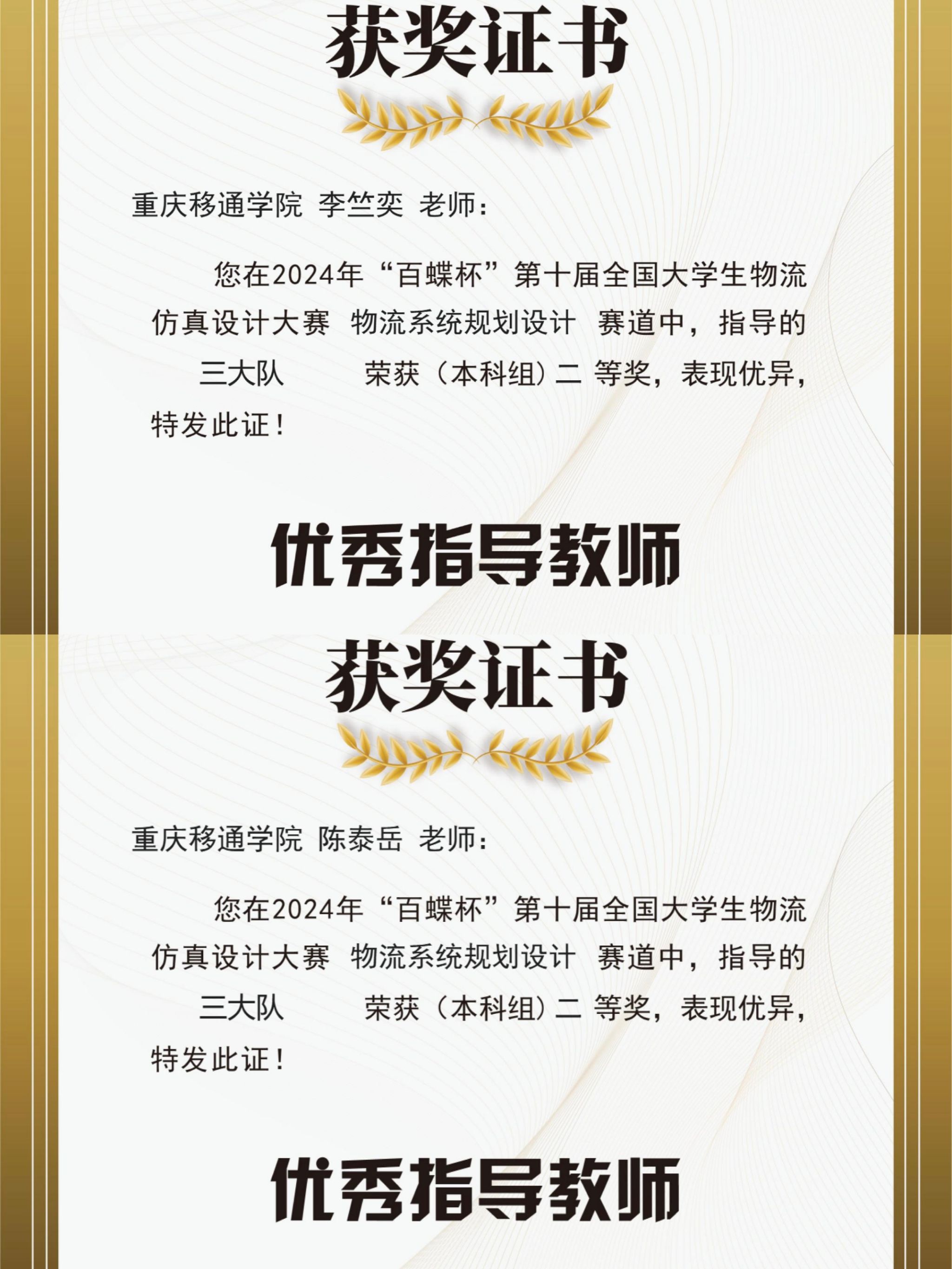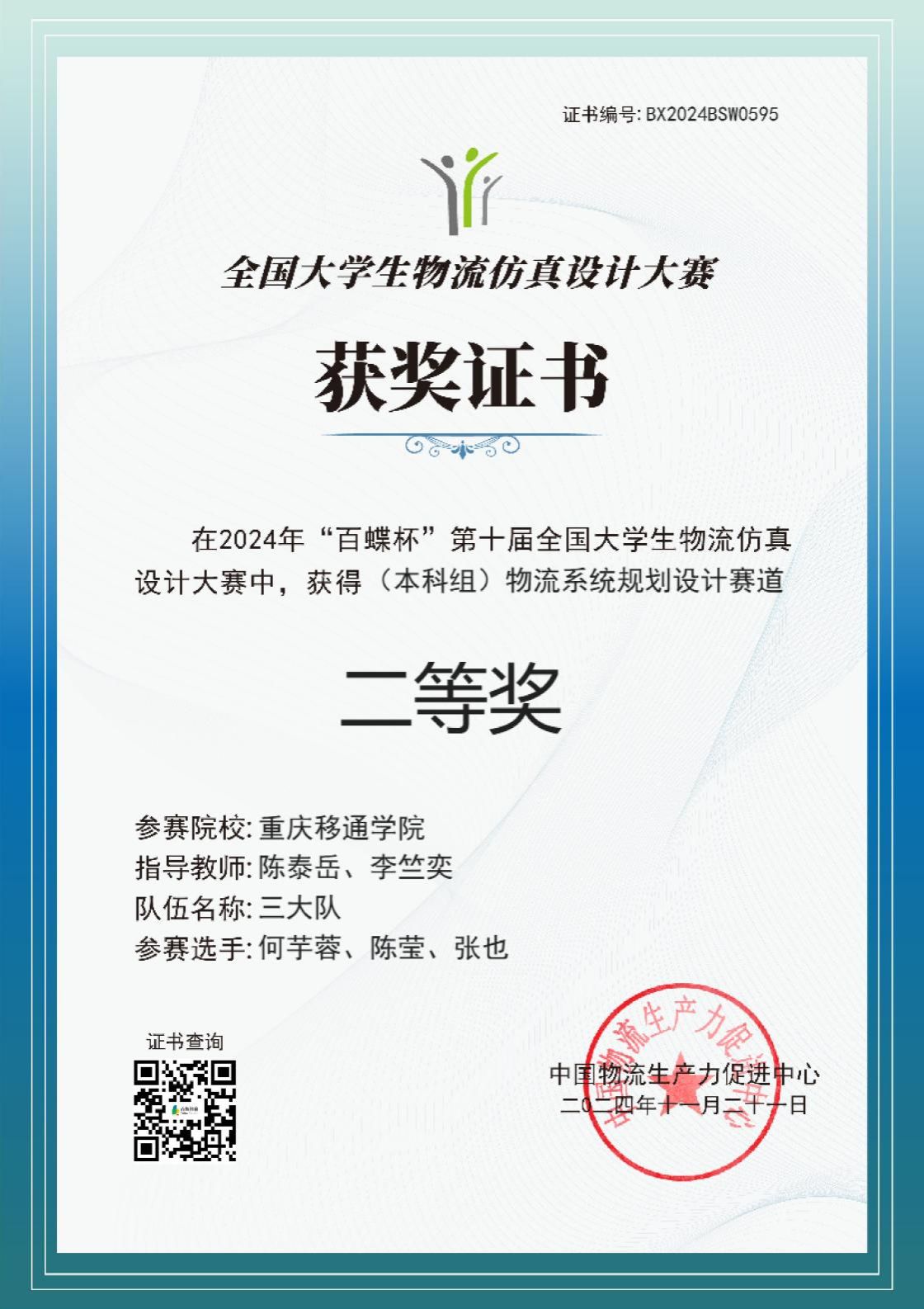近日,由中国物流生产力促进中心主办、上海百蝶教育科技有限公司承办,并得到《物流技术》杂志社媒体支持的2024年“百蝶杯”第十届全国大学生物流仿真设计大赛圆满落下帷幕。经过初赛和总决赛的激烈角逐,由供应链管理专业陈泰岳、李竺奕老师指导的学生参赛团队“三大队”在比赛中表现出色,荣获全国二等奖。