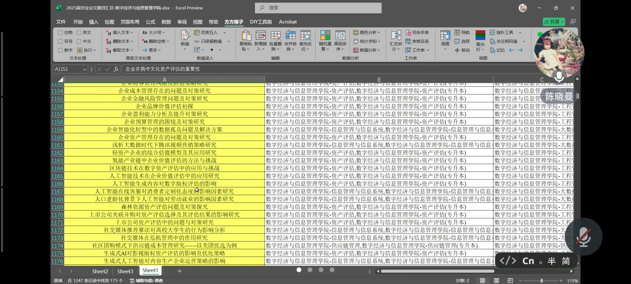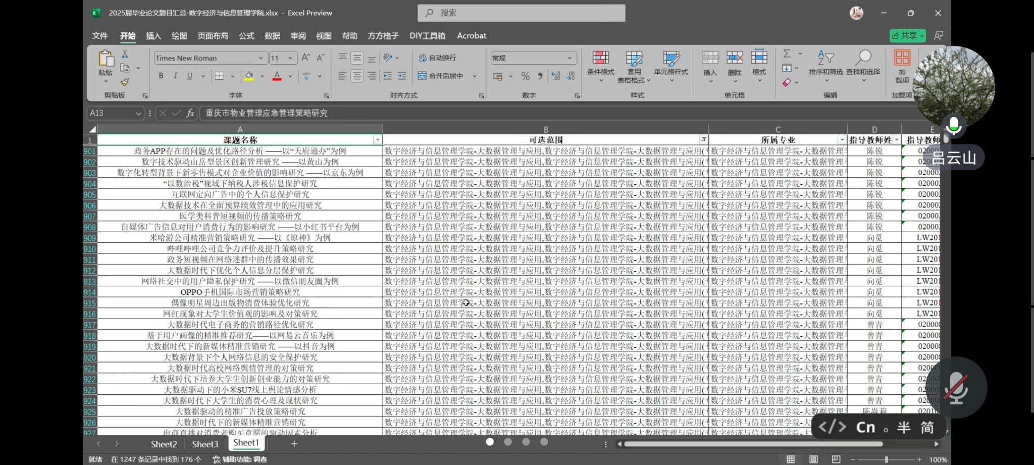 陈晓曼副院长首先肯定了数信学院2025届毕业论文选题相较2024届选题的进步和提升。然后,陈院长建议老师们给出选题时具备换位思考的意识,站在学生的角度思考选题的研究难易度和研究可行性。最后,陈院长建议给出论文选题时,选题应与学生平时所能接触到的知识相联系,这样有助于培养学生的逻辑思维能力和解决问题的能力,更有助于提前了解到真实的社会企业环境,从另一层面对学生毕业就业起到辅助性的作用。