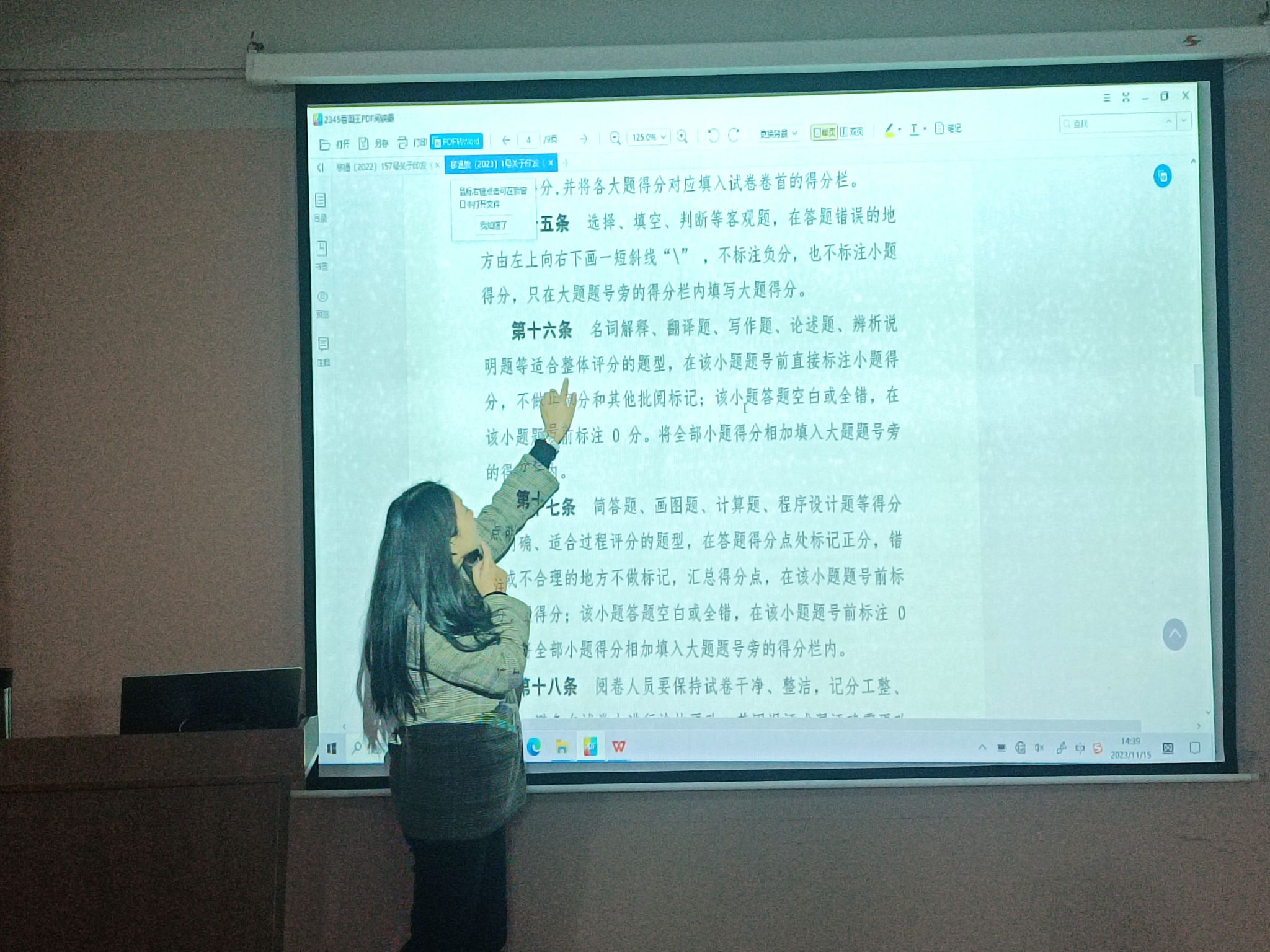 随后刘院长反馈了上学期期末试卷督导检查结果,结合评卷过程中出现的常见错误与各位老师进行了《移通教〔2023〕1号关于印发《试卷评阅工作规范(试行)》的通知》文件再学习,并就学院出现的一些不规范问题进行了原因分析,并给出了整改要求。