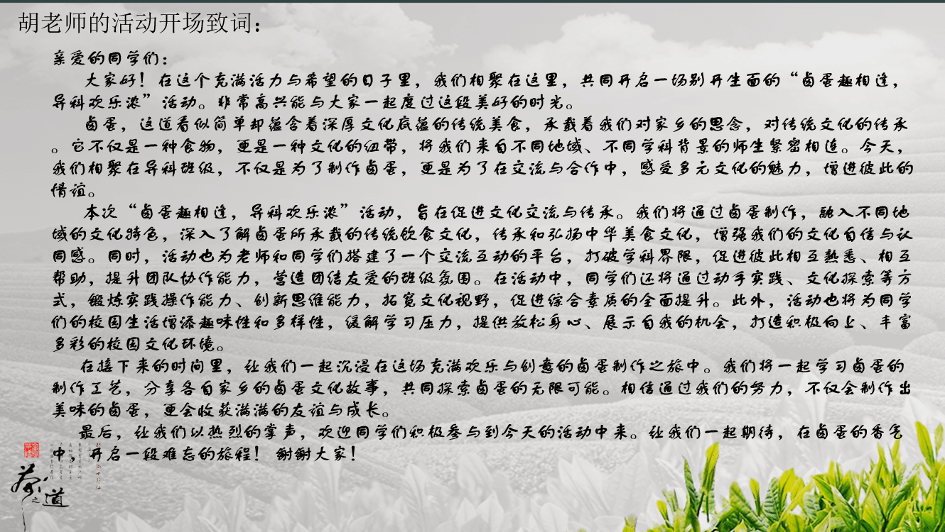 活动伊始,主持人热情开场,详细介绍了活动的主题、目的与规则,异科导师胡蓉老师随后远程发来致辞,为活动拉开欢乐序幕。在知识讲解环节,同学们深入了解了卤蛋的历史渊源、各地特色以及制作原理和流程,互动提问环节中,大家积极踊跃,现场气氛热烈。