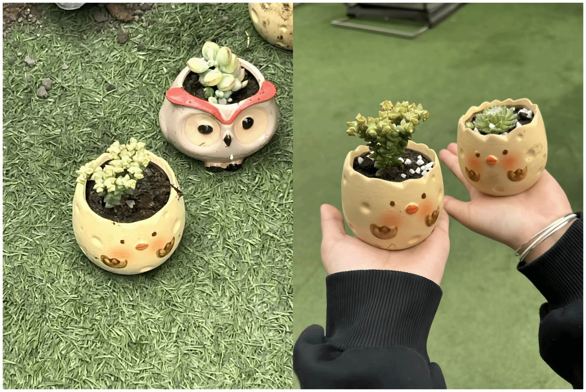 活动尾声的浇水环节考验着团队默契,同学们自动形成“传送带”:前排用长嘴壶沿盆边缓慢浸润,中间组检查渗水情况,后排负责擦拭水渍并摆放成品。小心根系、这盆需要补点营养土,此起彼伏的提示声中,70多个花盆如接力般在手中传递。看着原本杂乱的工作台渐渐被整齐的多肉方阵取代!