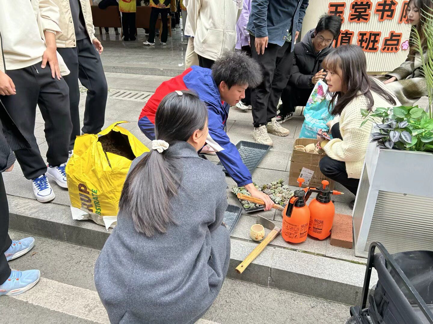 下午16时,活动在玉棠书院吴华英老师的现场教学示范中拉开帷幕,在混合营养土环节,同学们戴上手套化身“土壤调配师”。按比例将泥炭土、珍珠岩、蛭石等材料倒入大盆,吴老师说道“土壤就像多肉的‘家’,透气性和保水性必须达到黄金平衡。”她擦拭着额头的汗水,严谨的态度引得现场掌声连连。随着一袋袋原料变成蓬松的营养土,劳动的热情在春日暖阳下持续升温。