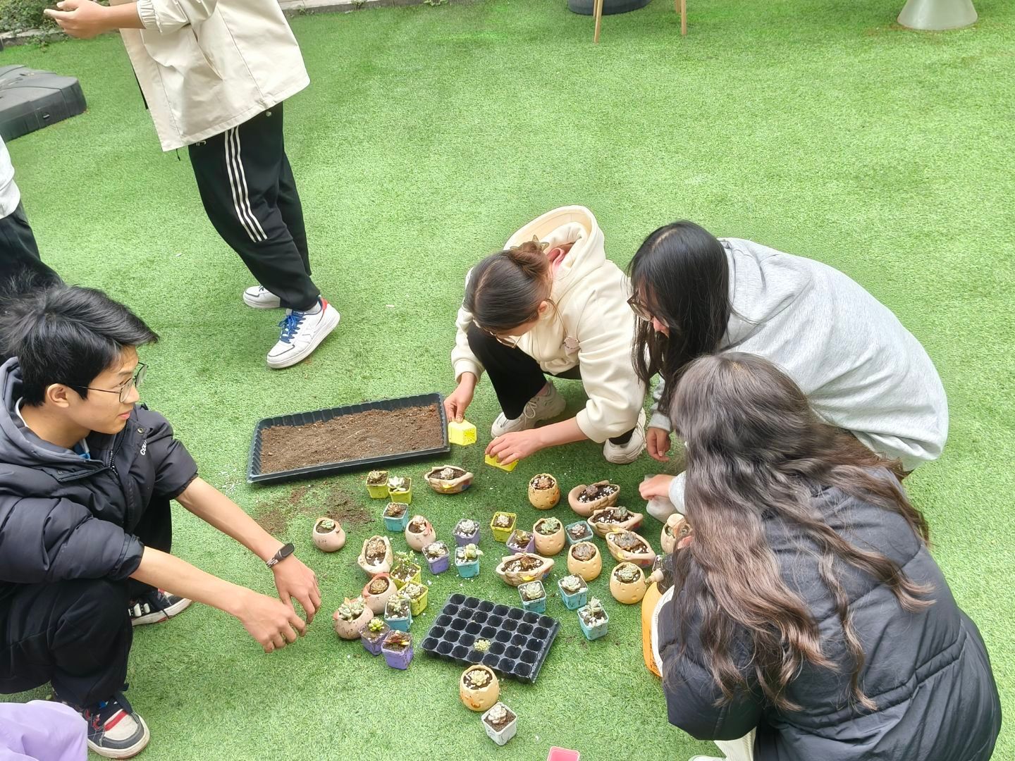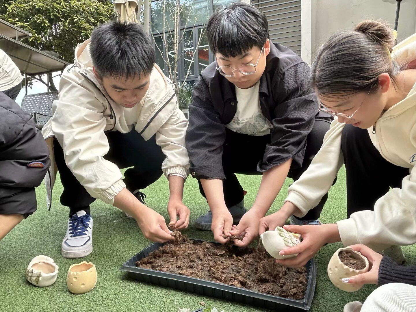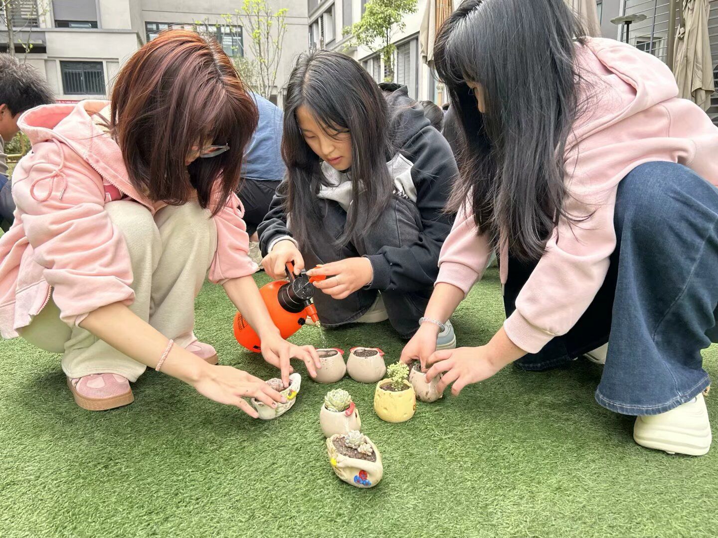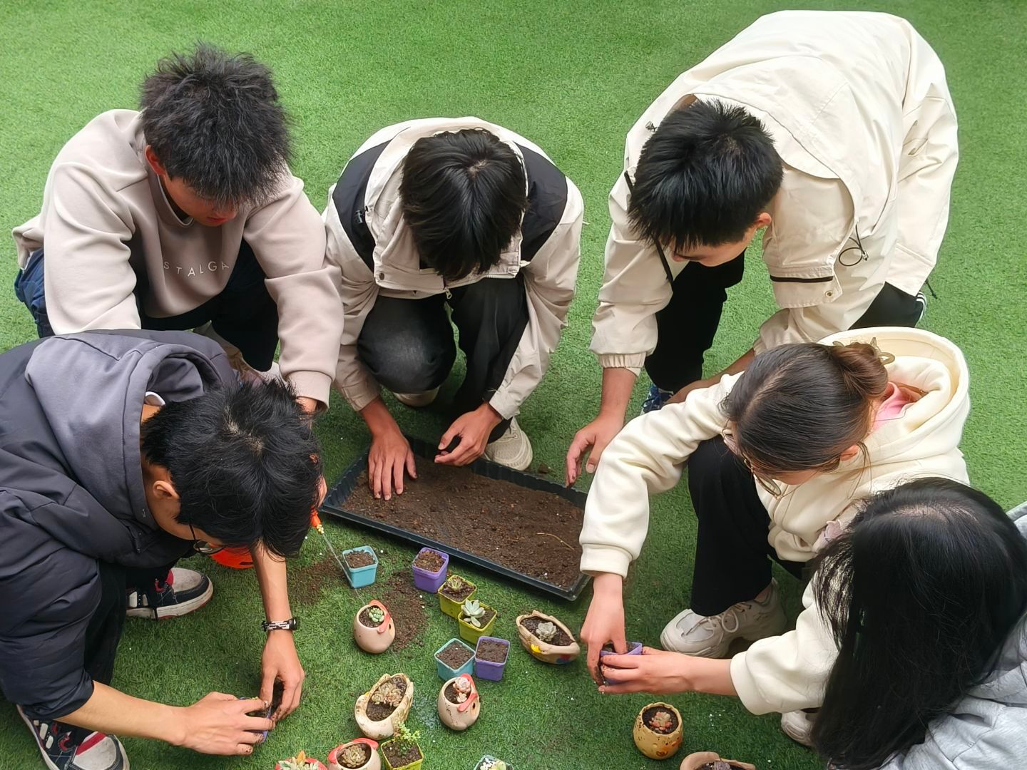 移植环节将活动推向高潮,同学们两人一组,小心翼翼地将多肉从育苗盘移入陶艺社特制的素烧花盆。活动现场洋溢着欢声笑语,有同学说道“多肉是自然艺术,石子装饰就是我们的二次创作。”劳动与学科思维的跨界碰撞,让实践课堂迸发出智慧的火花。