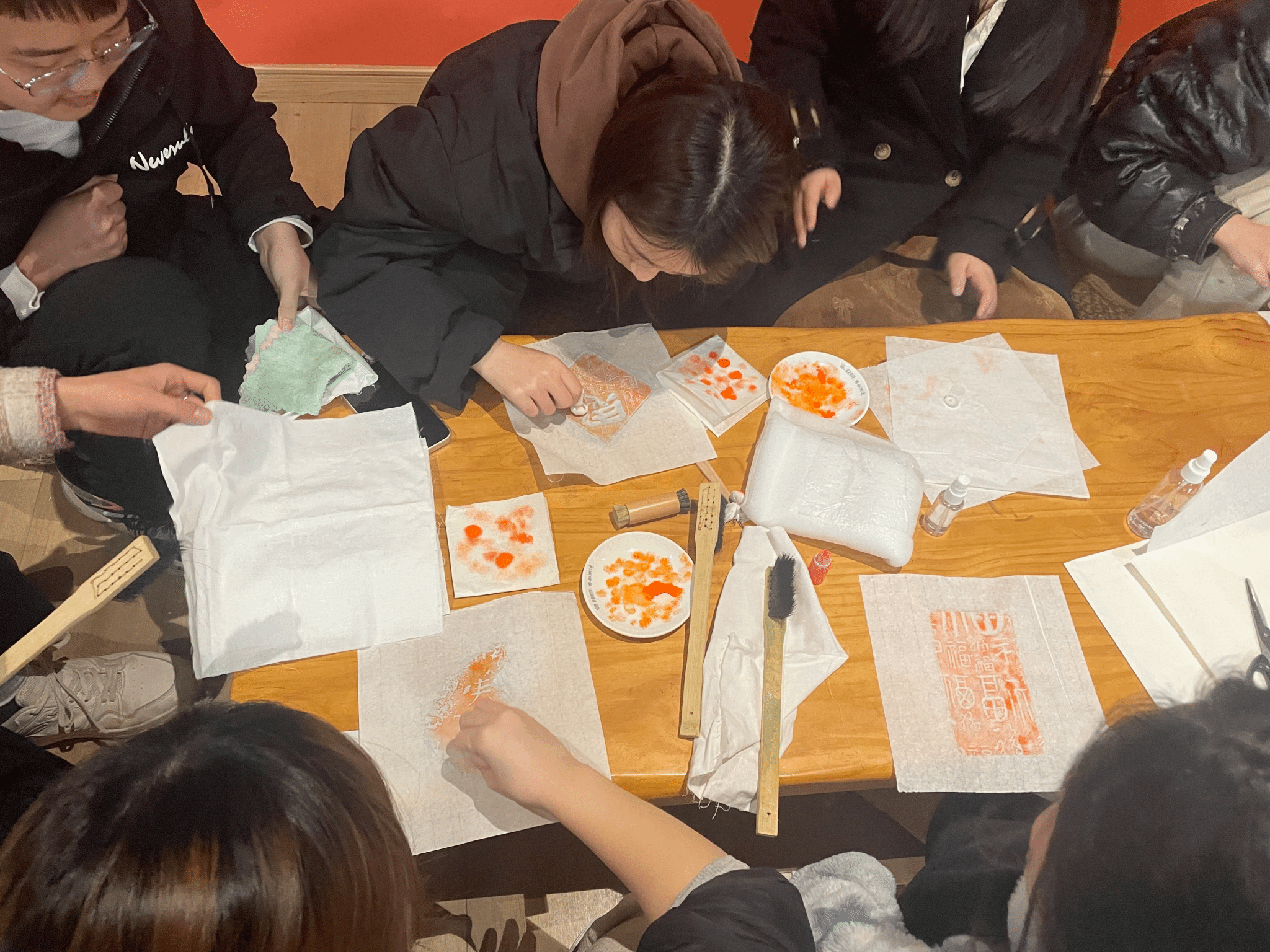 全生异科导师制是我校落实“三全育人”理念,坚持以学生全面发展为中心,促进学科交叉融合的重要举措。为深化大学生对中华优秀传统文化的认知与热爱,促进跨学科交流与融合,陈雯老师组织异科班小组成员于3月17日下午19:00在古剑书院书院白虹•半间闲室组织了一场非遗拓印体验活动。