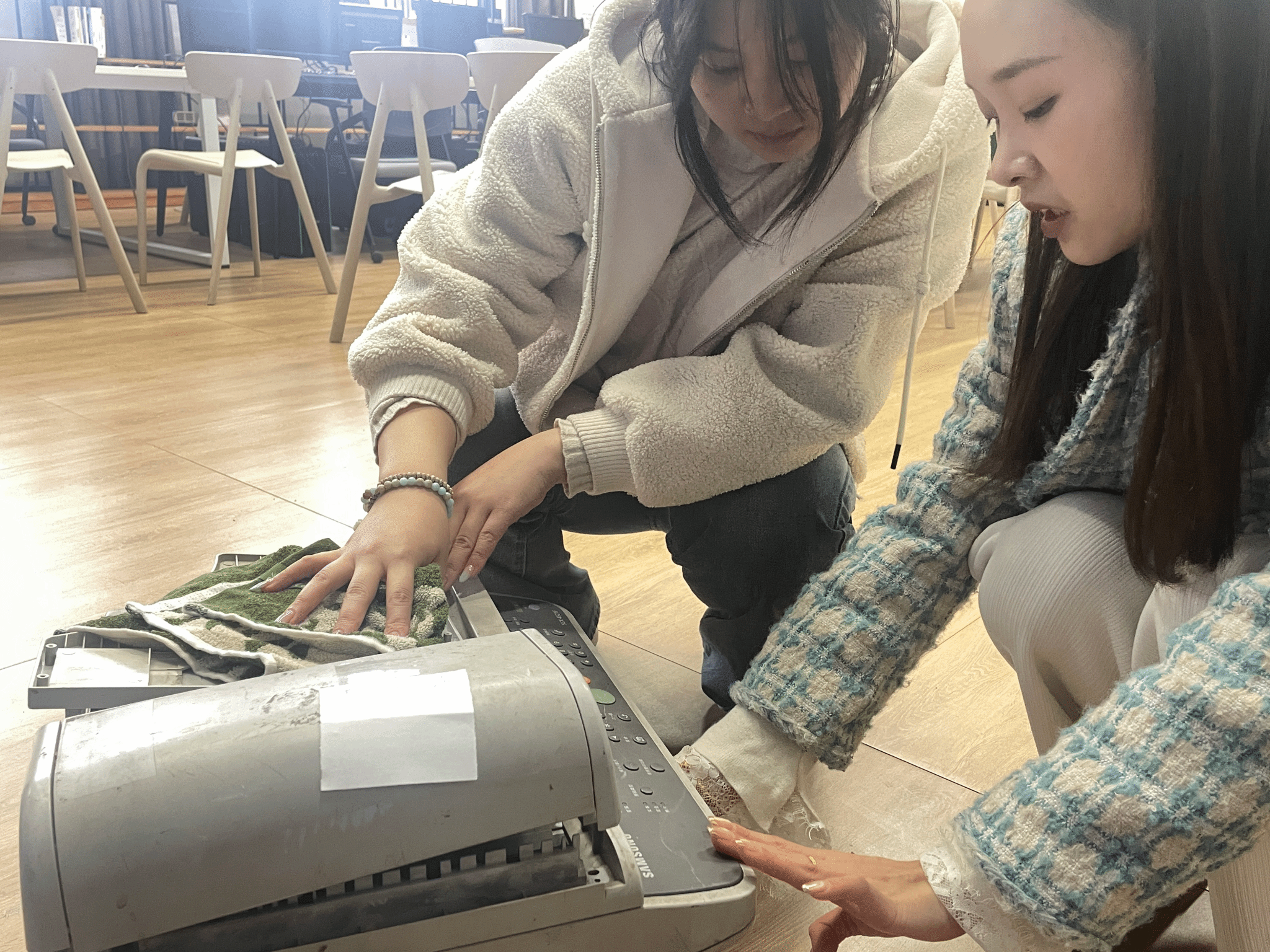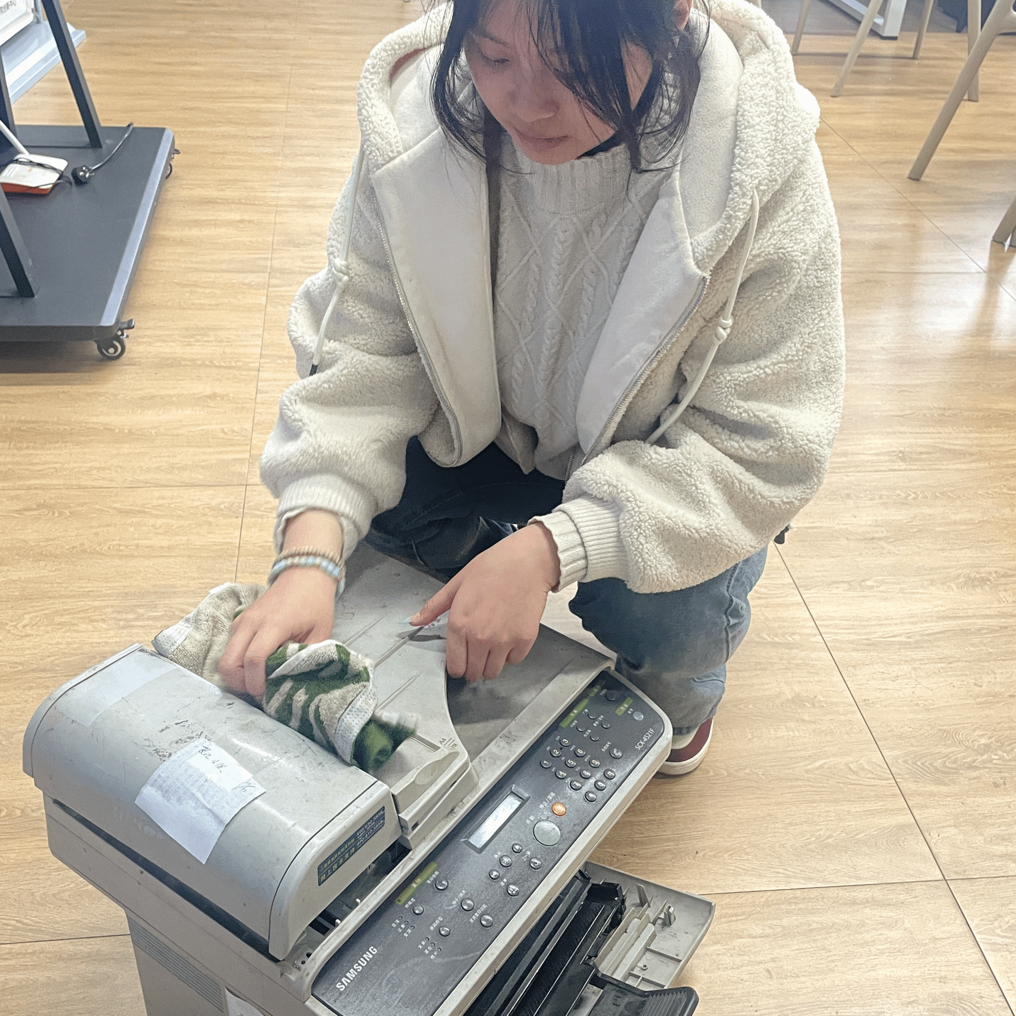 活动筹备之初,徐政老师自费购买了一批报废的打印机和耗材,作为未来培训的教学用具,这些设备虽然已被判定为无法修复,但其内部结构完好,非常适合作为学习办公设备维护维修的实物教材。然而,将这些沉重的设备从教师公寓搬运至横山书院的创新中心,却是一项不小的挑战,需要学生志愿者的鼎力相助。
