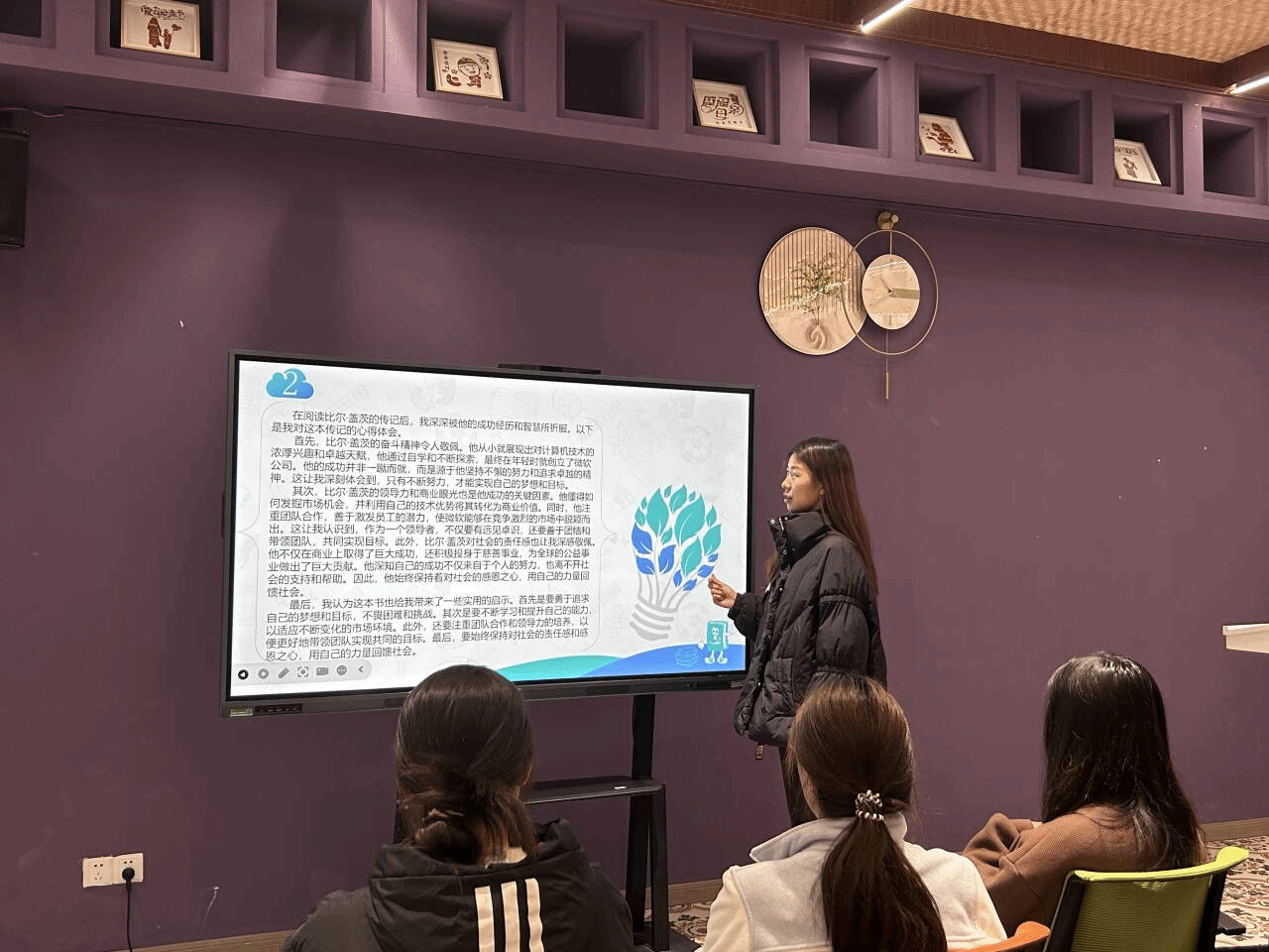 李玉同学所分享的是《比尔盖茨传》,让大家了解了他的奋斗精神与不畏困难,王贞雯同学分享的是《董明珠与格力》,让同学们看见了一位女士的传奇人生,学习了要坚持梦想,勇于拼搏。董芙媛同学分享的是《AI未来进行时》,这本书探讨了AI对人类生活得影响,让同学们受益匪浅。冉城炎同学分享的是《雷军传》,大家感受到了雷军的不懈努力与坚持。