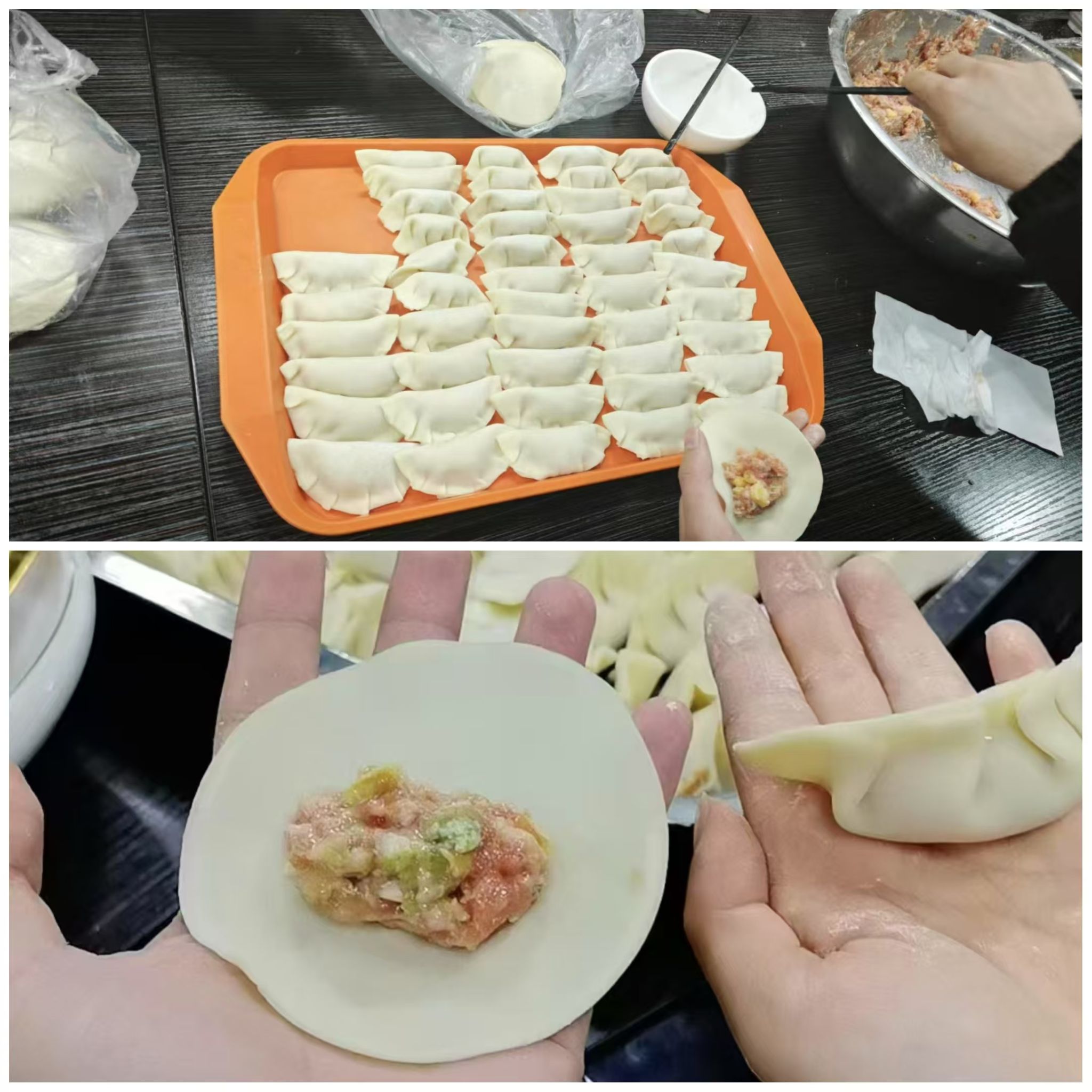 活动现场热闹非凡,欢声笑语此起彼伏。王棠棠老师早已准备好了饺子皮、馅料等食材,整齐地摆放在桌上。一到场,同学们便迫不及待地卷起袖子,洗净双手,开始动手包饺子。有的同学手法娴熟,包出的饺子个个皮薄馅大、形状规整;而一部分同学虽然是第一次尝试,但在老师的指导下逐渐掌握了技巧,包出的饺子虽形状各异,却充满了创意与乐趣。
