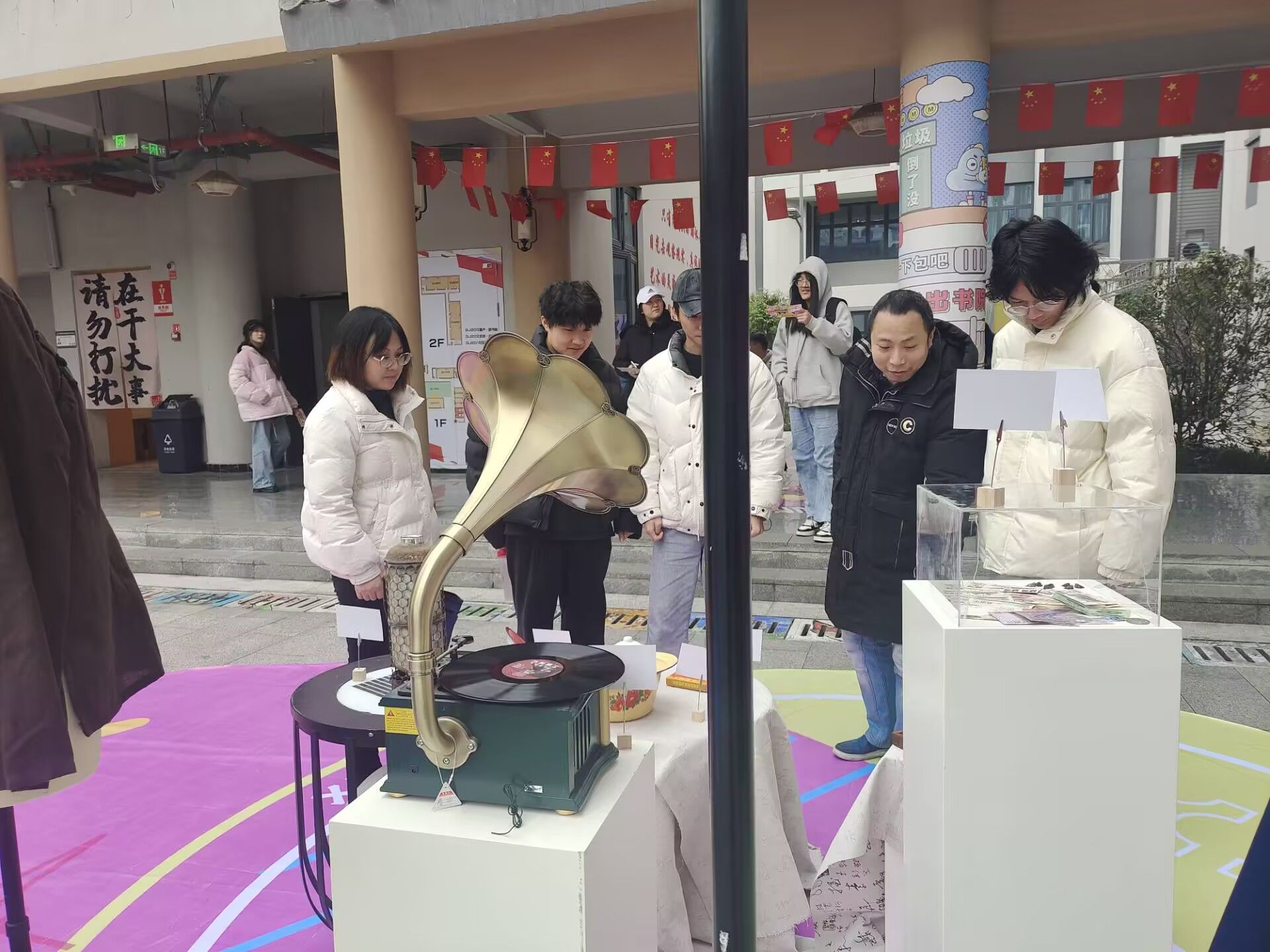在李老师和徐老师的引领下,同学们带着对未知的好奇与对美好的向往,有序地步入展览区。一踏入展览区,仿佛穿越了时空隧道,从现代都市的喧嚣中瞬间抽离,来到了一个充满旧日情怀与雅致生活的空间。展览区内,展品错落有致,从唱片机到保温瓶,每一件都闪耀着独特的光芒,诉说着各自的故事。