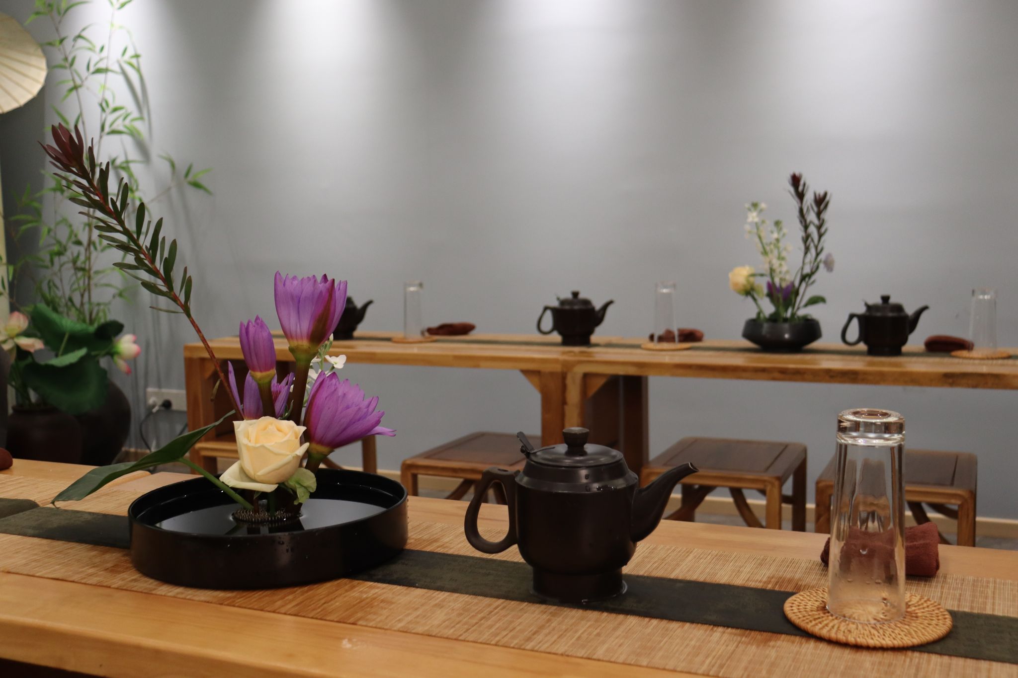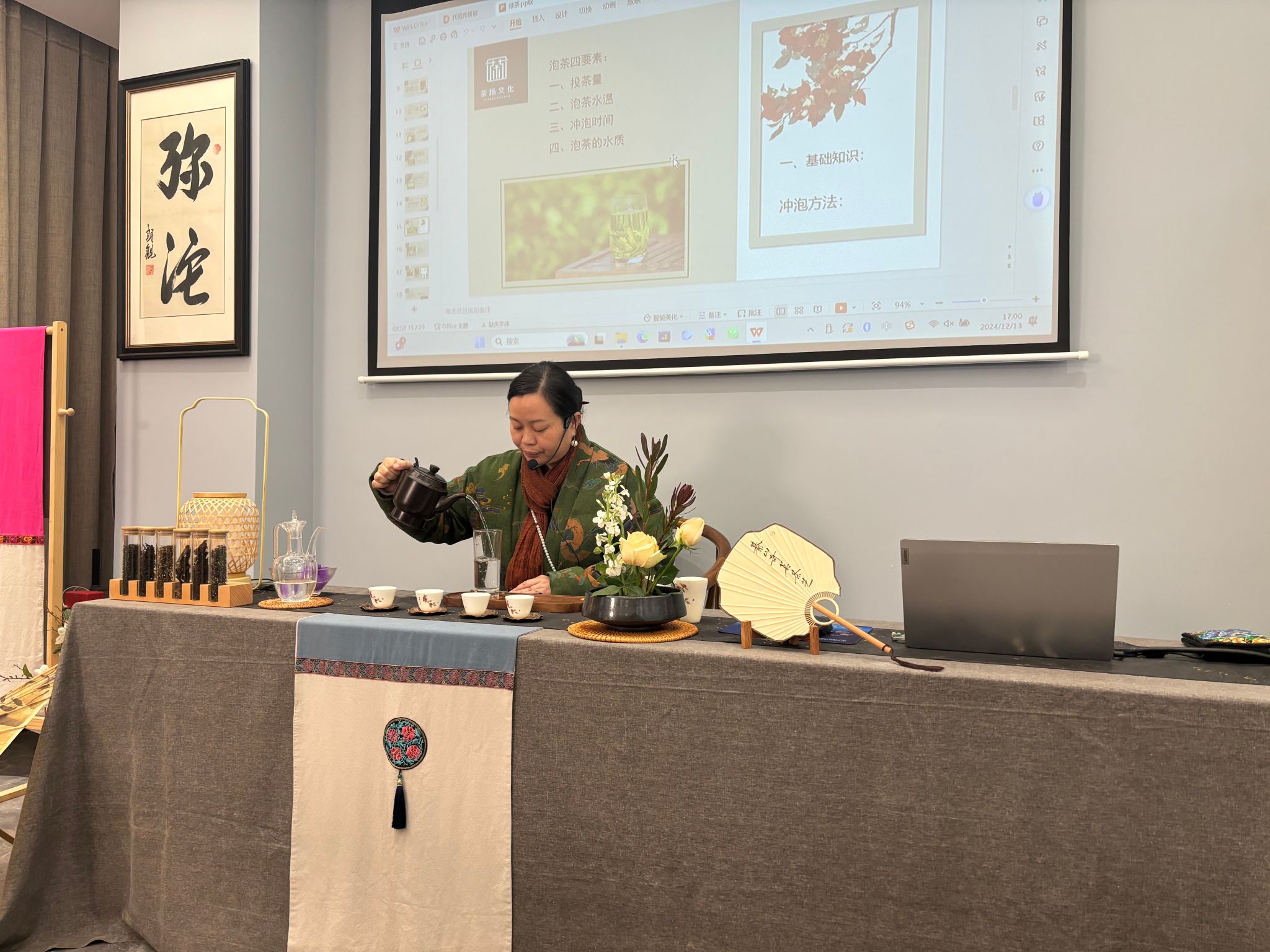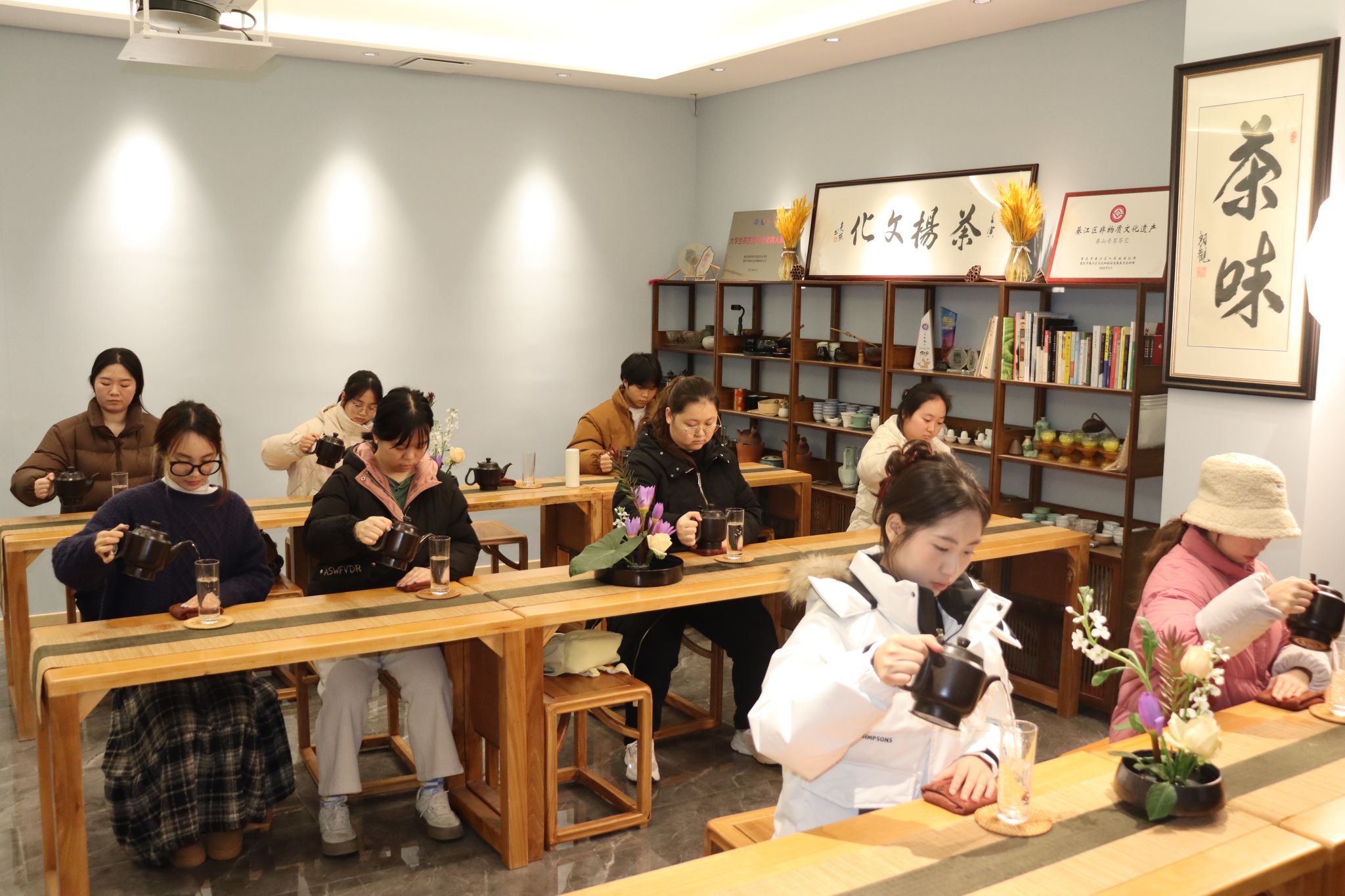 在理论知识的铺垫后,徐老师亲自示范并带领陈雪媛老师和同学们共同练习沏泡绿茶的步骤。定点注水,水流精准而稳定地注入茶杯,宛如一场细腻的春雨滋润着大地;高山流水,水流潺潺而下,带着灵动的韵律,仿佛山间清澈的溪流;凤凰三点头,水壶轻提慢落,恰似凤凰优雅的点头致意,不仅是一种冲泡技巧,更是对宾客的尊重与欢迎。师生们全神贯注地模仿学习,在一招一式中感受着茶艺的严谨与优雅,袅袅茶香弥漫在书院的每一个角落,为寒冷的冬日增添了一抹温暖与宁静。