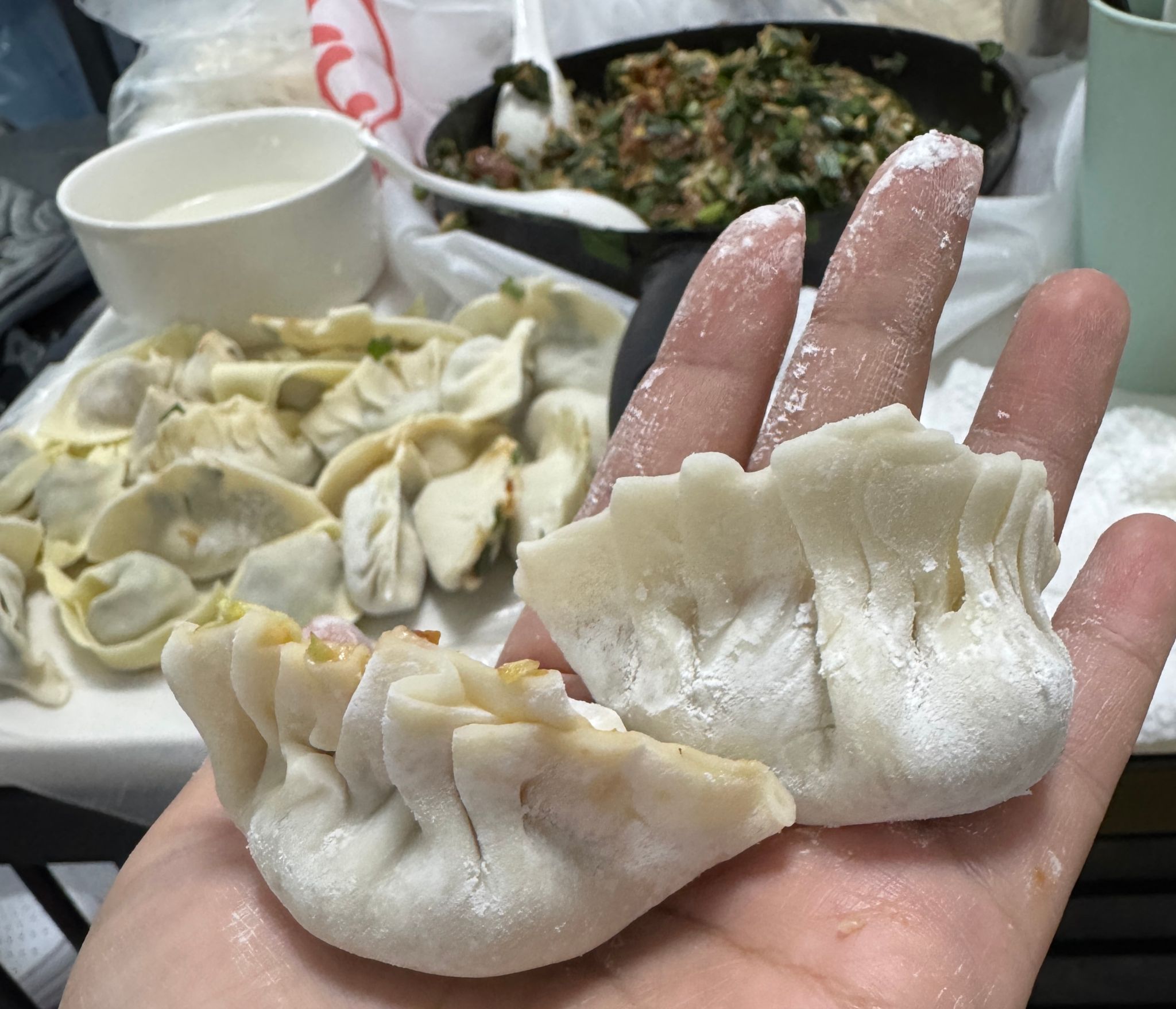 活动现场,师生们热情高涨,纷纷撸起袖子,洗手准备大展身手。大家分工明确,配合默契,有的负责调馅,有的则专注于包出各种形状的饺子,现场欢声笑语不断,气氛十分热烈。学生们充分发挥自己的生活技能,手法娴熟地包出一个个饱满的饺子,同时还做起了“小老师”,为大家讲解包饺子的技巧和方法,老师们认真聆听,积极尝试,尽管他们的手法略显生疏,但那份专注和热情丝毫不减,逐渐从 “新手小白” 成长为 “包饺子小能手”。不一会儿,案板上就摆满了形态各异、排列整齐的饺子,有传统的月牙饺、圆滚滚的元宝饺,还有创意十足的麦穗饺、小笼包饺等,每一个饺子都蕴含着师生们的奇思妙想和对美食的热爱。
