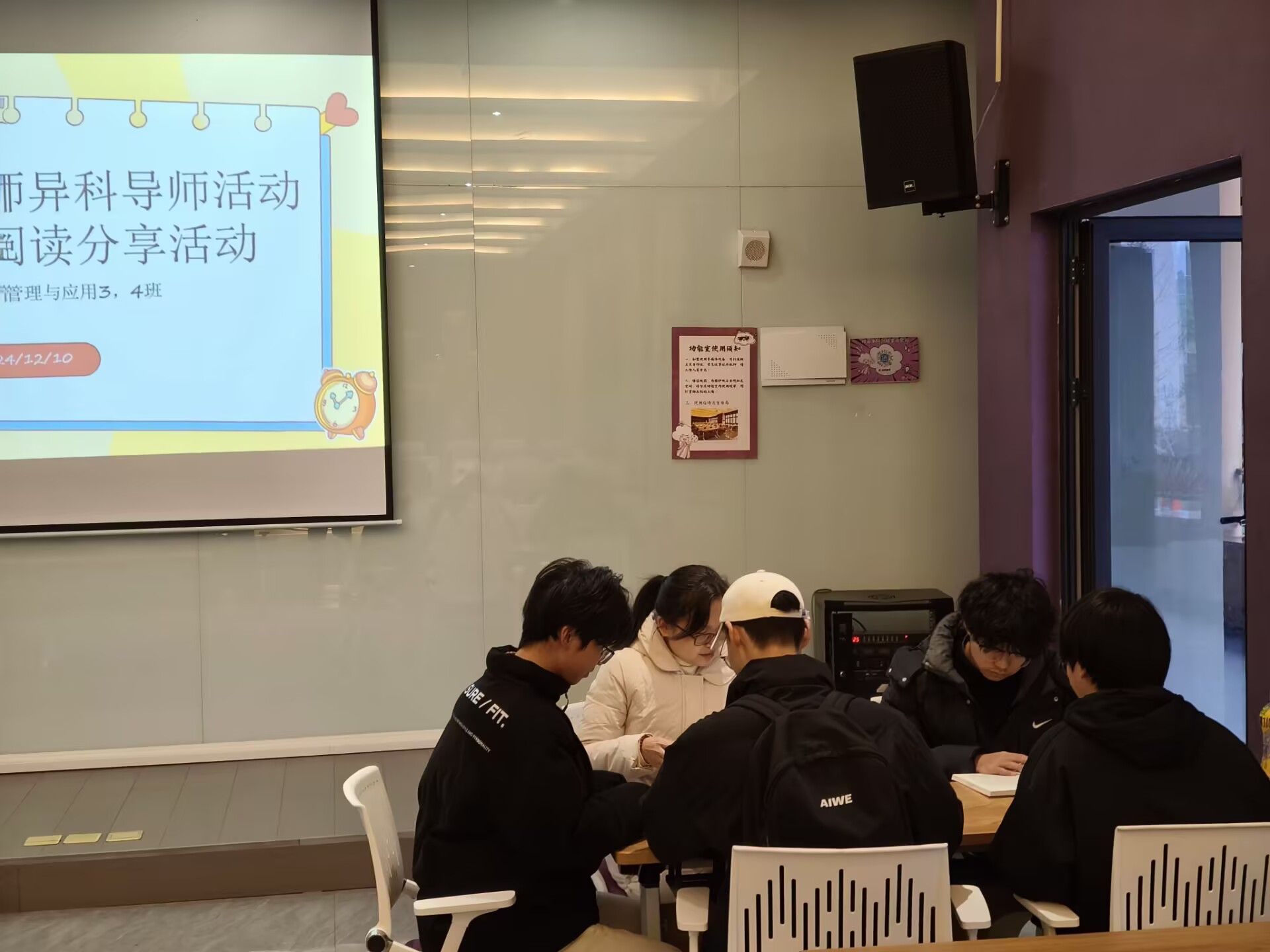 在知识的海洋中遨游,从书籍中汲取智慧与力量,是个人成长不可或缺的重要途径。为落实全生异科导师制度,响应全生异科导师为学生的“以学生充分发展为中心”的教育理念,异科导师李静毅携手2024级大数据管理与应用3班的部分同学于12月10日下午在观云书院冬至多媒体教室开展了主题为“读大咖传记,悟成长之道”的异科导师活动。