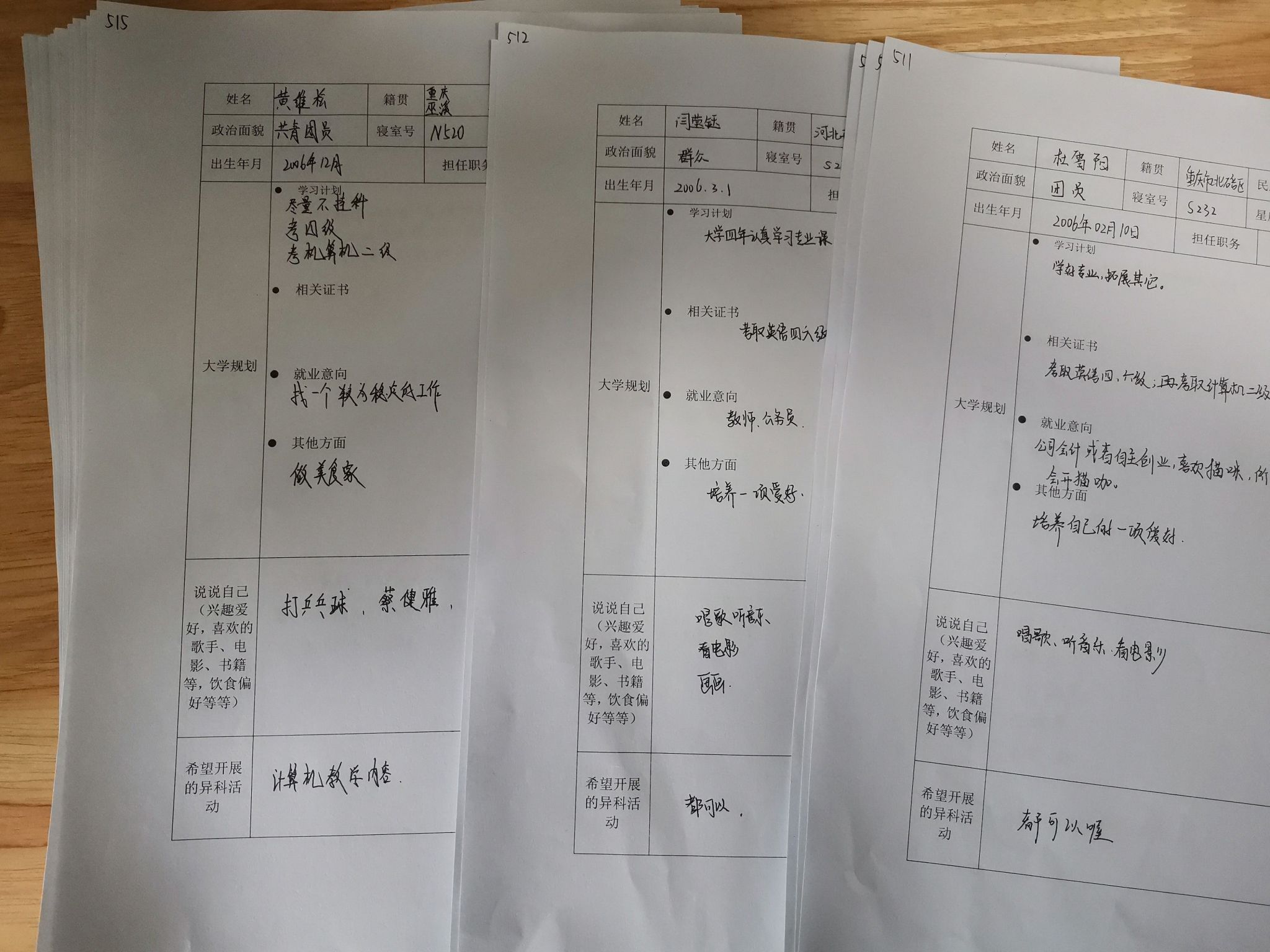 最后,同学们填写了个人档案,记录了大学四年的学习规划和考证需求,分享了自己的兴趣爱好和期待的异科活动。大多数同学对大学生活有初步的规划,他们希望学好专业知识的同时,能够通过四六级和计算机二级,还希望能够考取专业相关的证书。同学们的兴趣也非常地广泛,有的喜欢计算机二级、读书分享等学习活动,有的喜欢唱歌、打球等休闲娱乐活动。胡老师进行了记录,建立个人档案,便于后期开展丰富有趣的活动。