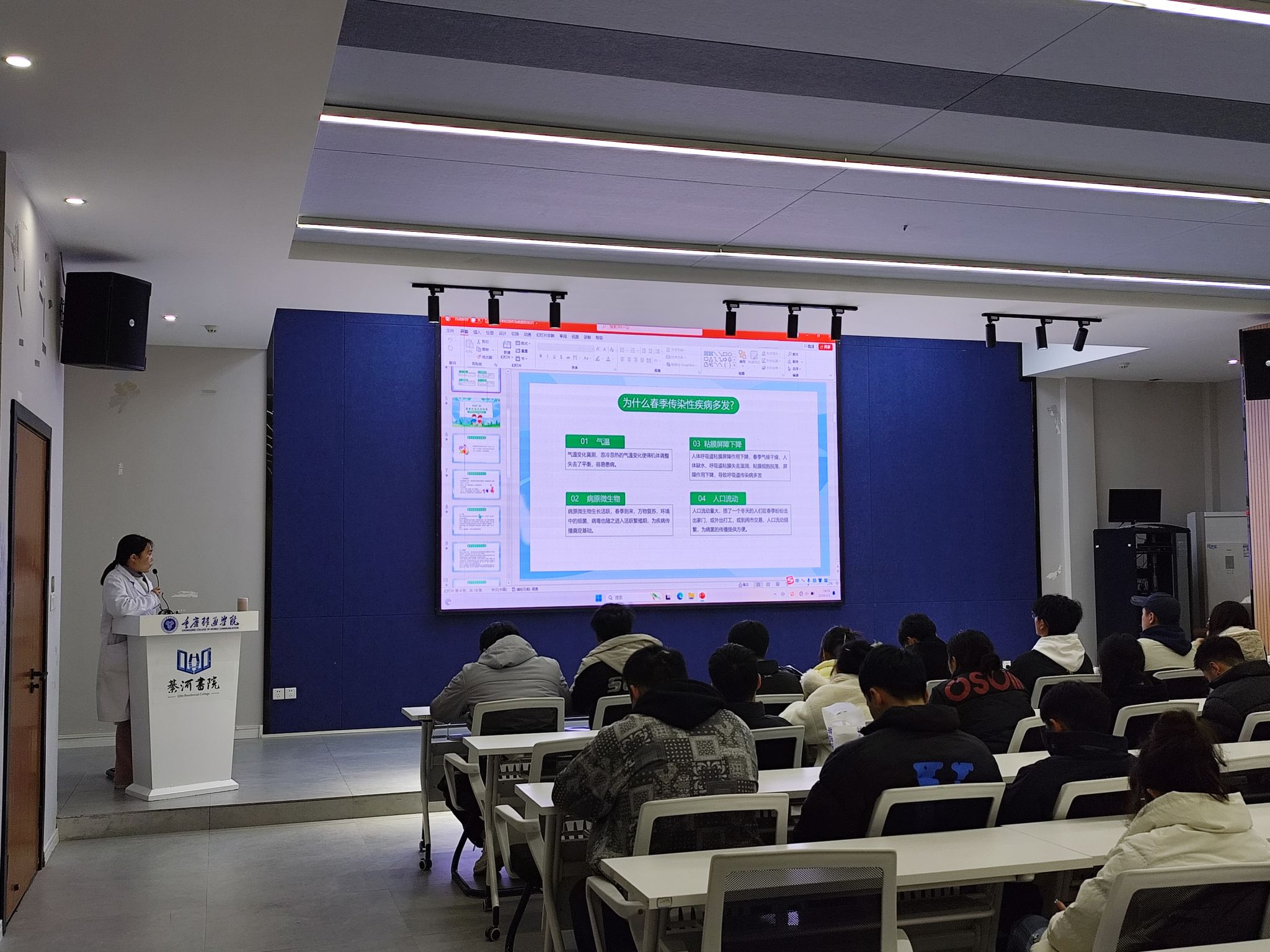 春季是传染病的高发季节,学校作为人群高度密集场所,学生近距离频繁接触,大大增加传染病的传播风险。为让同学们在传染病高发期做好自我防护,学习自我防护知识,2024年3月1日下午两点半,数字经济与信息管理学院异科导师王棠棠联合、信息安全学院江蓉老师、计算机学院柴医保老师、谢一阳老师邀请医务室医生在綦河书院二号楼观涛-多功能报告厅共同开展春季校园传染病预防专题讲座。