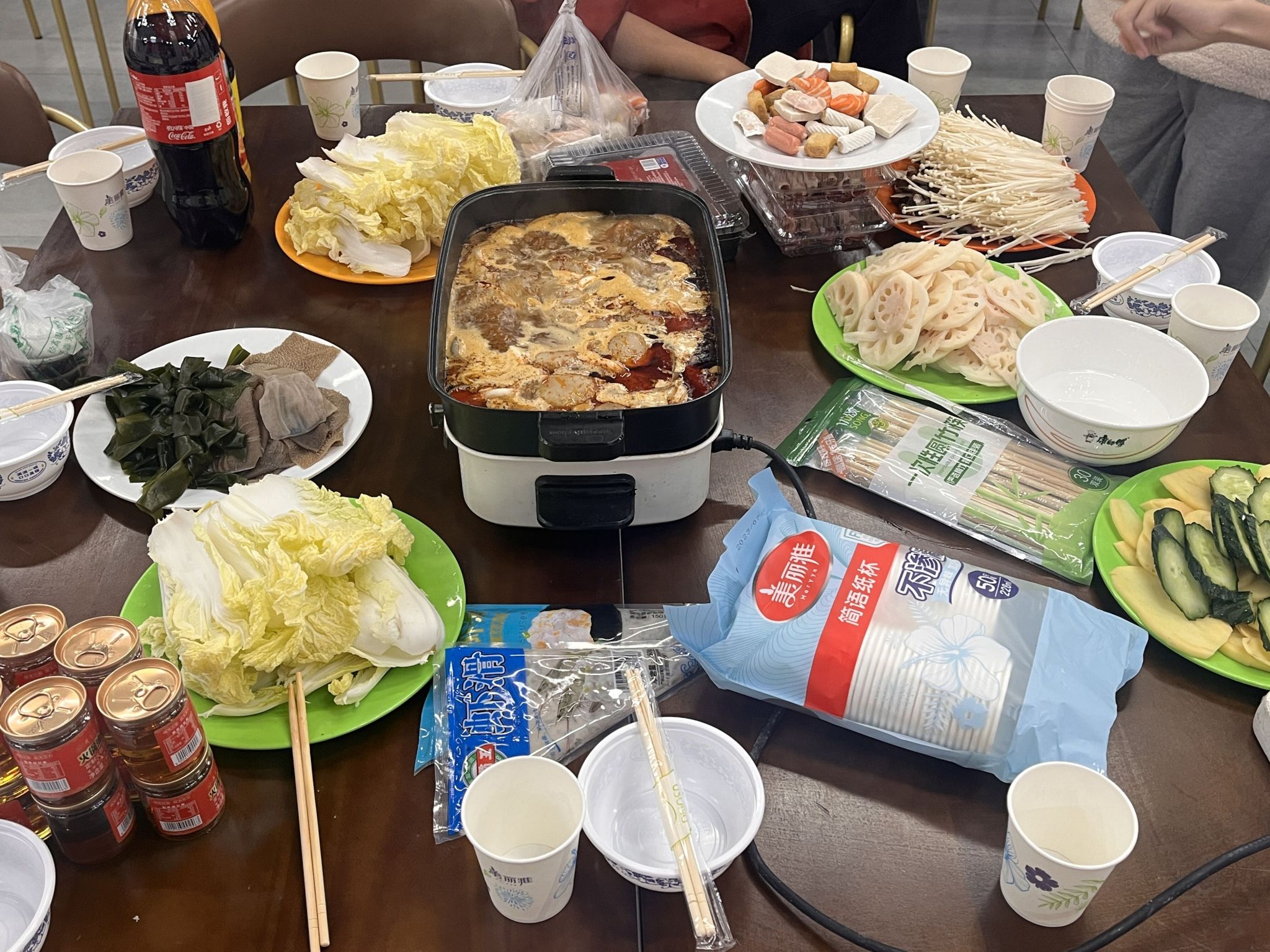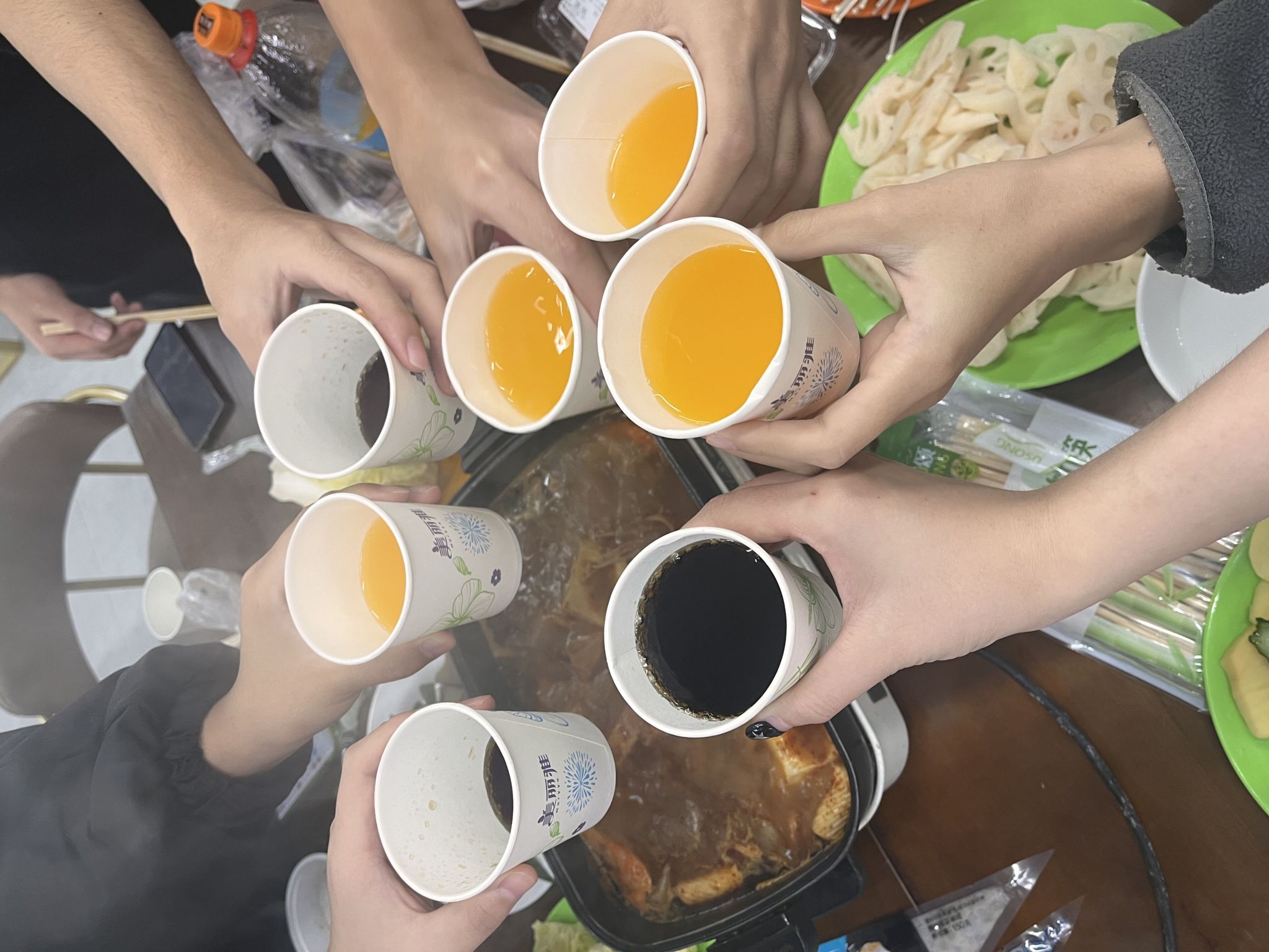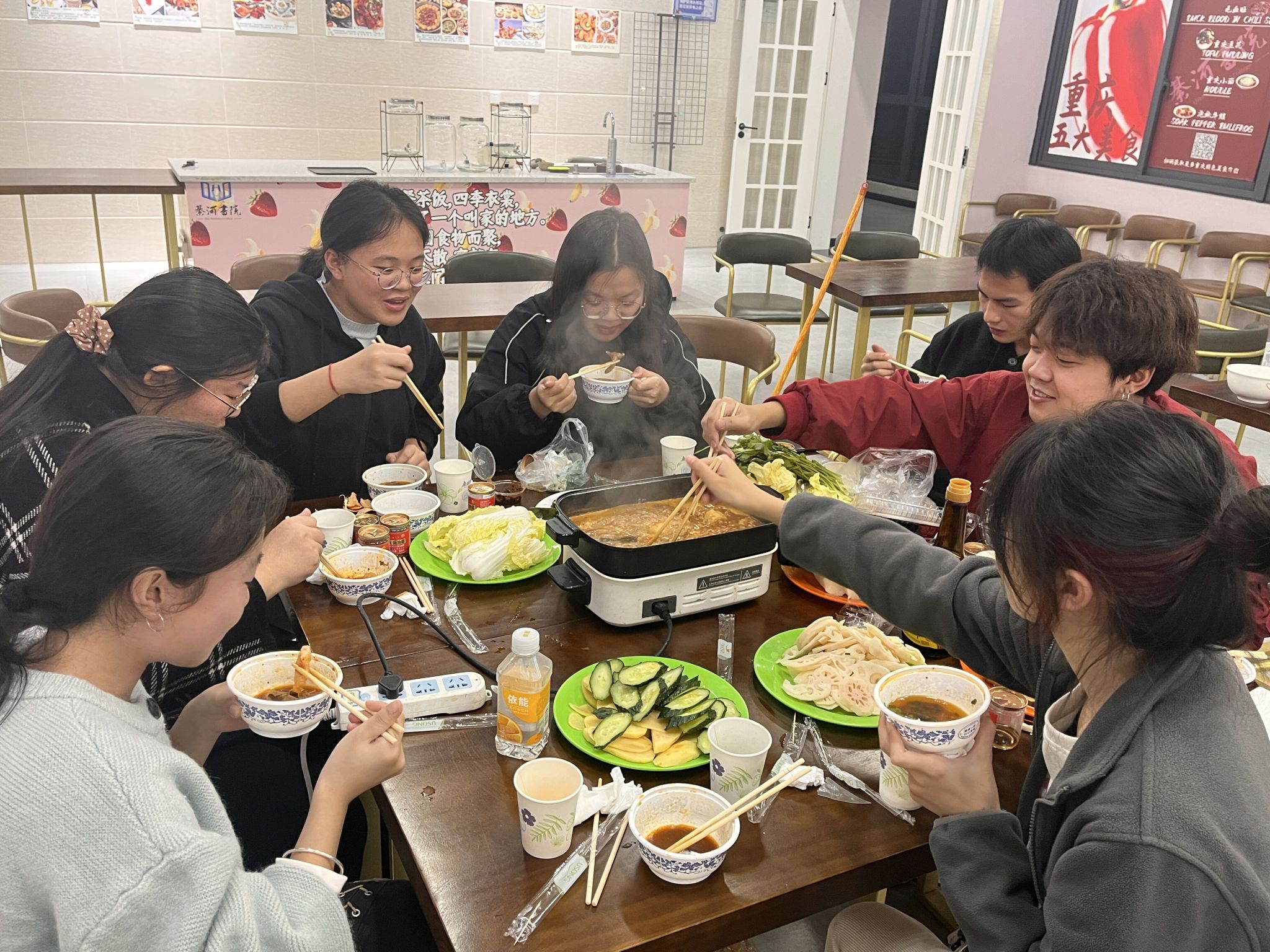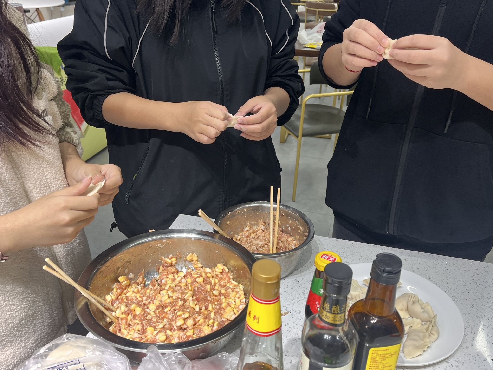 为了组织这次活动,老师们与同学们提早安排,王陈老师和负责采购的同学在校门口集合,出发超市去购买此次团建需要的食材:新鲜充足的饺子皮、馅料,火锅配菜等。一切都准备就绪,师生们欢聚一堂,揉面、擀皮、包饺子、端送食材,煮饺子,洗菜,炒火锅底料,有条不紊开始忙碌起来。当饺子和热气腾腾的火锅呈现在大家面前时,兴奋和喜悦之情也随着热气与香气上升到了顶点。