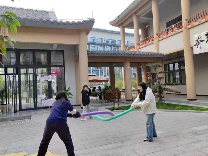 抓杆游戏不仅考验同学们的反应能力,也要求同学们和旁边的人相互配合,才可能顺利抓到杆子,同时也不能心急,否则就有可能发生失误。“U型管传球”是一款集休闲、智能和乐趣于一体的游戏,每位参赛者手里拿着一个引导槽,排队连接手中的引导槽。工作人员在起点放一个乒乓球,运动员需要使用引导槽将乒乓球传给下一个队友,在转移过程中,手不能触球、摔倒或返回。最后一名队员应将球准确地传递到末端的桶中,在“U型管传球”游戏中,队员们相互沟通协调,在游戏中释放压力,提高沟通和团队合作能力;学生们相互支持,打破沉默、退缩和焦虑,合作完成障碍之路,并在此过程中进行自我探索和自我表达。蒙眼打人能够挑战大家的感官和反应能力,帮助同学们变得更加敏锐。