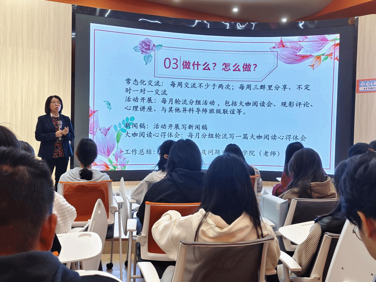 故事来到高潮部分,杨晓红老师用浅显易懂的语言重点讲解了什么是全生异科导师制度,以及全生异科导师制度需要做些什么,从而更好的消解大家的疑虑,从她的讲解中,大家也了解到了全生异科导师制度,并对其有了更深的认识,以及坚定了要积极认真参与到全生异科导师制度中的决定。