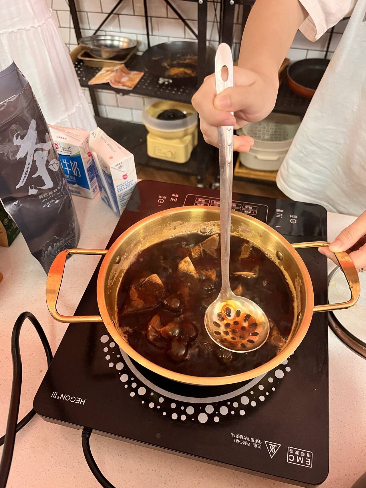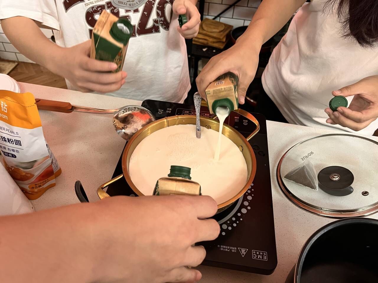 活动当天成员来到烘培坊,先是人员签到、物资清点、工具清洗,然后活动开始,异科导师给成员们讲解奶茶、珍珠制作所需的食材使用事项及操作步骤等,随后现场共同演绎制作奶茶的过程。香浓的奶香引起了大家的浓厚兴趣,并一起分工操作。不一会儿,第一杯茶香浓郁的奶茶制作完成了。由于牛奶与茶叶比例问题,第一杯奶茶以失败告终,老师鼓励组员们再接再厉,一定可以成功。
