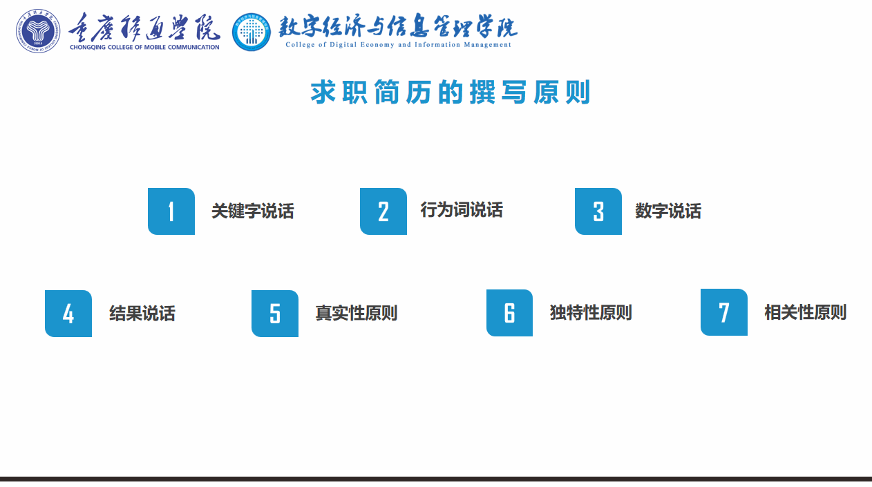 首先,廖阳老师强调了简历对大家的重要性。简历是求职者在应聘过程中的重要材料,起作用是对招聘者进行一个全面而简洁的介绍,从而使招聘这能够快速了解求职者的一些基本情况和一些重要信息等等。同时廖阳老师在分享中强调:“一份好的简历能让我们事半功倍,简历是我们每一个同学们在求职过程中的一份‘职业装’,同时也是我们获得求职机会的‘敲门砖’”。