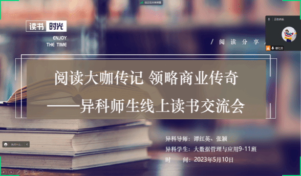遇见好书,启智增慧。为积极响应我校“信息产业大咖传记阅读计划”,拓展学生的知识面,培养学生阅读的好习惯,2023年5月10日下午3点在腾讯会议进行“阅读大咖传记,领略商业传奇”主题的异科师生线上读书交流会。本次会议由异科导师谭红英老师和张颖老师联合举办,带领大数据管理与应用9班、10班、11班的同学一起探索这书籍中的奥秘。