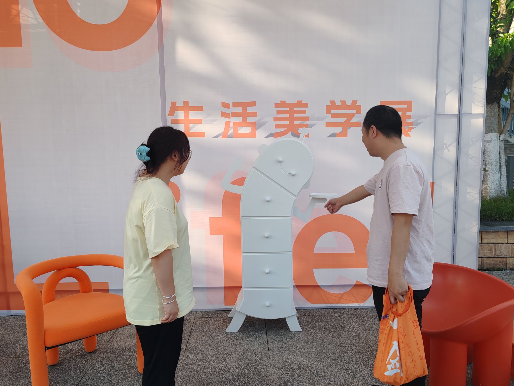 一个弯腰拟人储物柜吸引了学生们的目光。它的造型独特,既有趣又实用。徐老师为学生们介绍道:“这件家具的设计理念是将实用性与趣味性相结合,让人们在日常生活中也能感受到艺术的魅力。它不仅可以用来储存物品,还能成为空间中的一道亮丽风景线。”学生们纷纷围上前去,仔细观察着储物柜的细节,对设计师的创意赞叹不已。李老师则从不同角度拍摄,展现出储物柜的独特魅力。