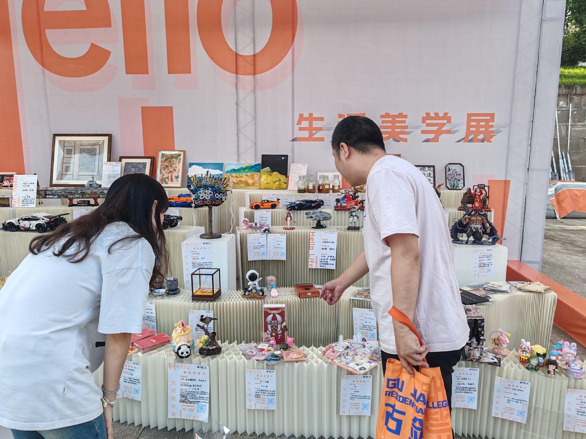 踏入瀛山图书馆广场左侧的藏品区,仿佛进入了一个充满故事与情感的世界。展品有序陈列,每一件都携带着“热爱”“陪伴”等独特的情绪标签,串联起了手办、油画、蜡染等物件的个体记忆与集体情感。