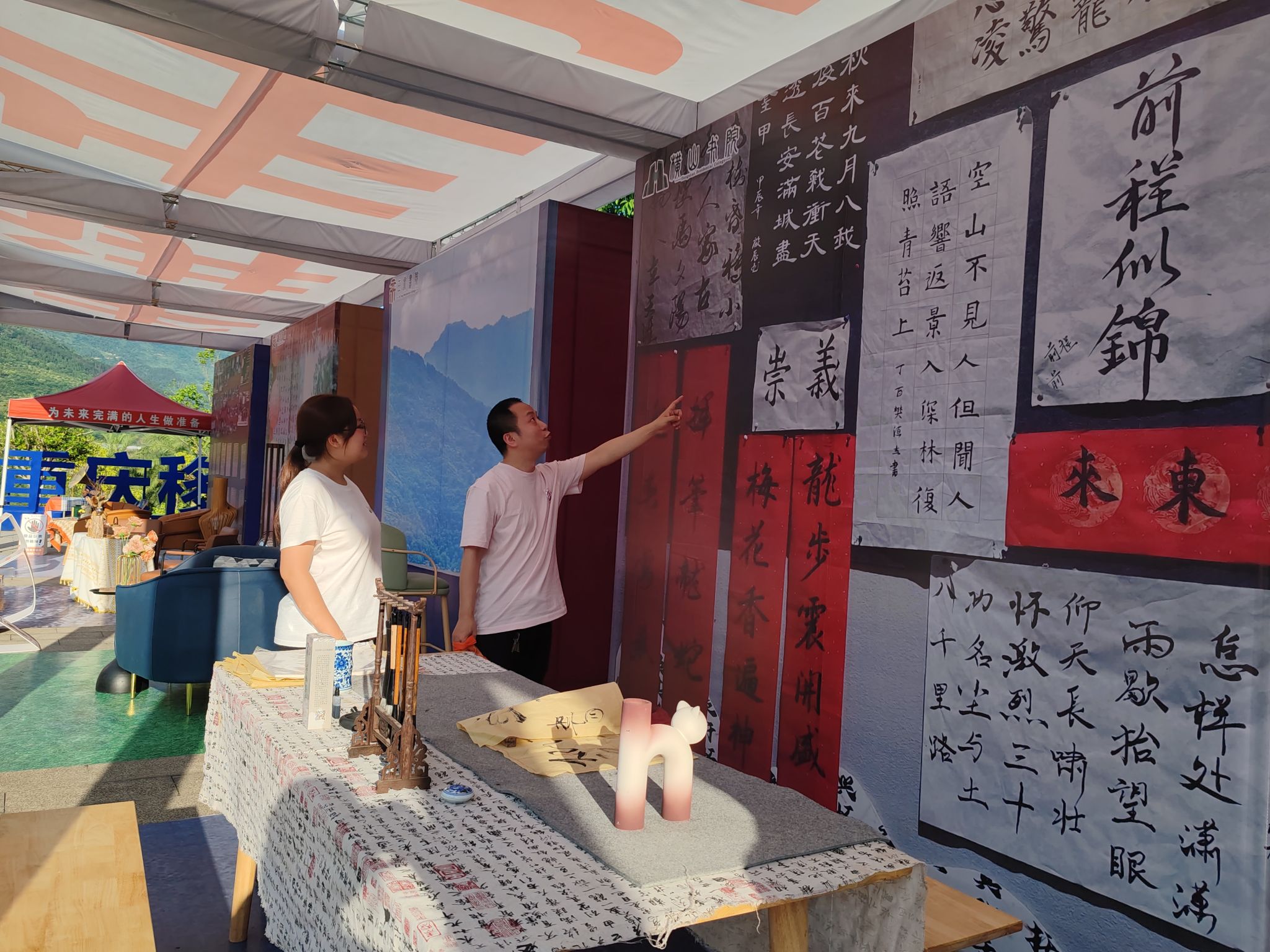 接着徐老师带学生们来到横山书院书法角。这里墨香四溢,几张书法桌上摆放着笔墨纸砚,墙上挂着一些书法作品。徐老师带着学生们走近观看,说:“书法是中华民族的传统文化瑰宝,它不仅能培养我们的耐心和专注力,还能让我们感受到汉字的独特魅力。”学生们被书法家的技艺所折服,李老师用镜头记录下这精彩一幕。