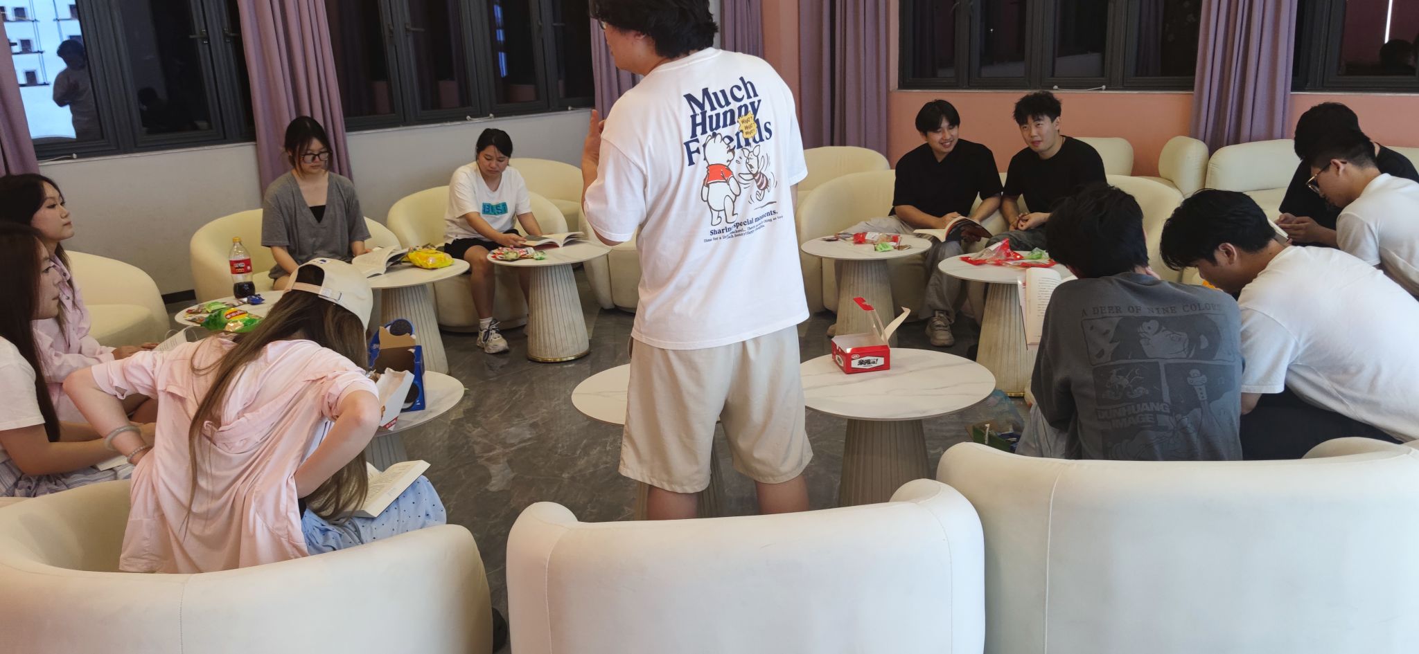 2025年6月18日晚19:00,綦江校区丁山书院“202天秤座·朋辈交流中心”内书香弥漫,氛围热烈。数字经济商学院异科导师钟翔组织12名学生,在此成功举办了一场主题为“对话商业巨擘,汲取创新智慧”的大咖阅读分享活动,引导学子们在跨界阅读中拓展视野,激发思维活力。