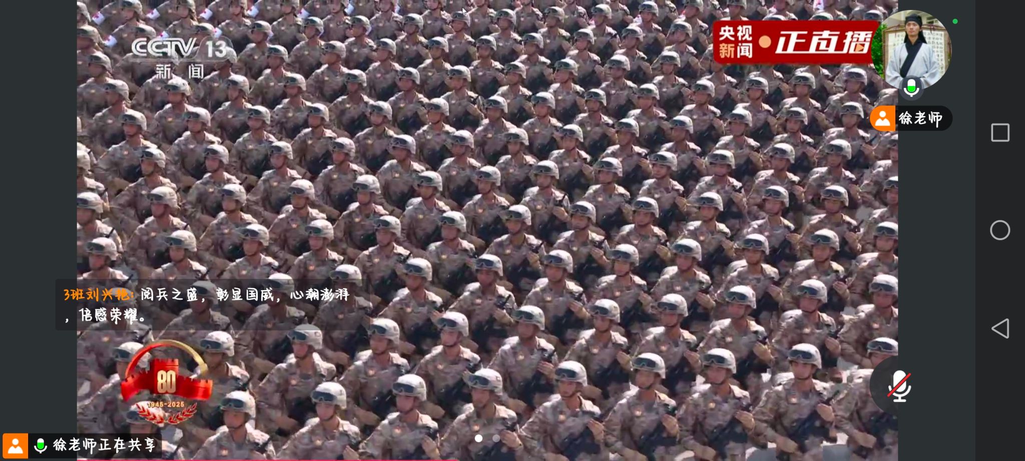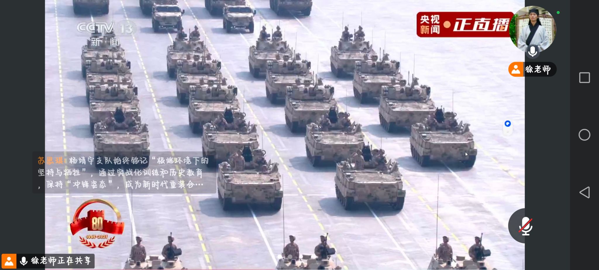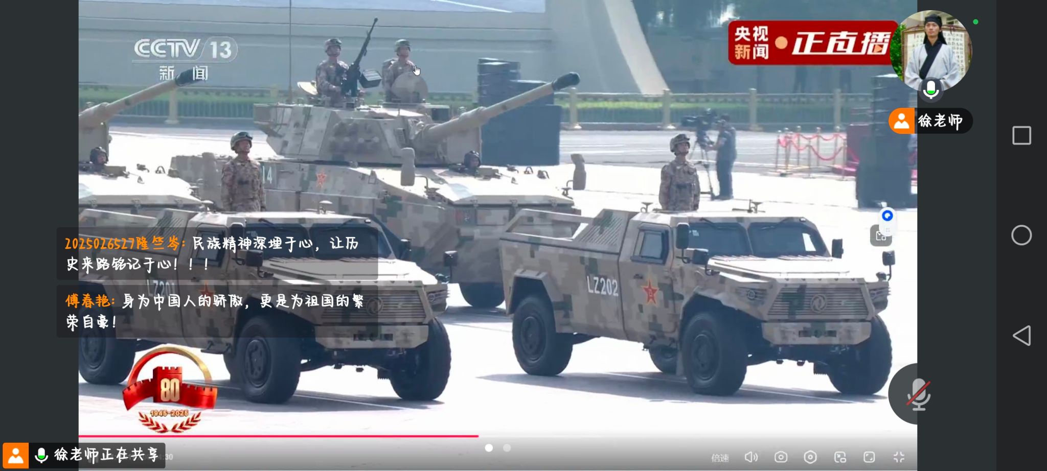 晚上九点,随着徐老师点击"共享屏幕",天安门广场的盛况跃然眼前。三位教师化身"交流引导者":徐老师以亲切的语调开启话题,李老师用生动的比喻解读装备亮点,舒老师则捕捉阅兵场上的温暖细节。当受阅方阵迈着整齐步伐通过时,聊天窗口突然闪过一条消息:"这步伐里藏着中国军人的精气神!"瞬间点燃了讨论氛围。