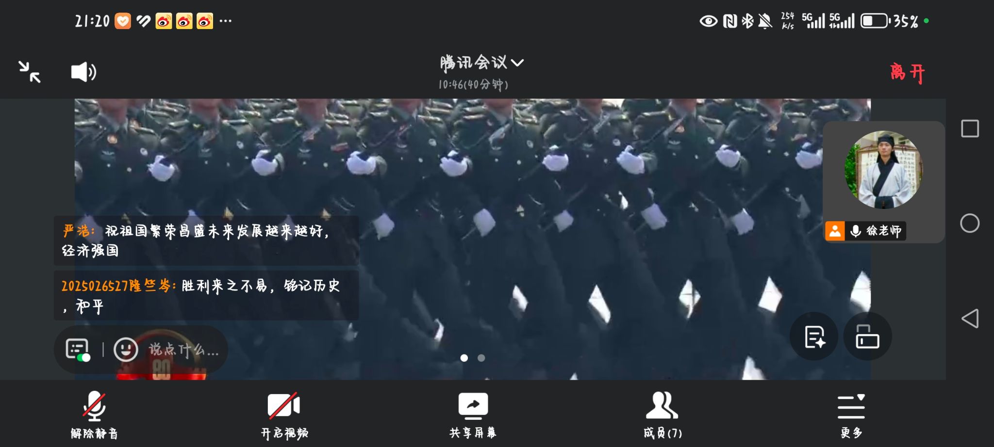 2025年9月3日晚九点,一场云端交流会在腾讯会议平台温暖启幕。异科导师徐政、李旎、舒玉红与几位异科班学生共同观看2025年九三阅兵回放,通过"屏幕共享+云端对话"的形式,搭建起青年交流爱国情怀的互动平台。