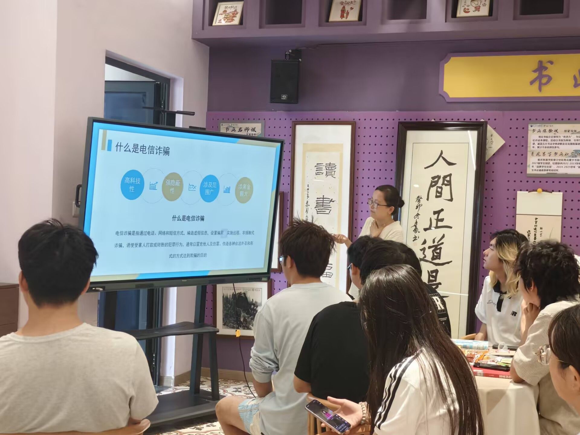 随后,李老师围绕 “什么是电信诈骗” 展开讲解,明确电信诈骗是通过电话、网络和短信方式,编造虚假信息设置骗局,实施远程、非接触式诈骗,诱使受害人打款或转账的犯罪行为。她还总结出电信诈骗 “高科技性、强隐蔽性、涉及范围广、涉案金额大” 四大特点,并结合数据指出,近 10 年国内电信诈骗案件以每年 20%-30% 的速度激增,2015 年相关经济损失高达 222 亿,单个案件最高涉案金额超亿元,且犯罪团队分工明确,涵盖开发制作、批发零售、诈骗实施、分赃销赃等多个环节,让同学们对电信诈骗的危害性与复杂性有了全面认知。