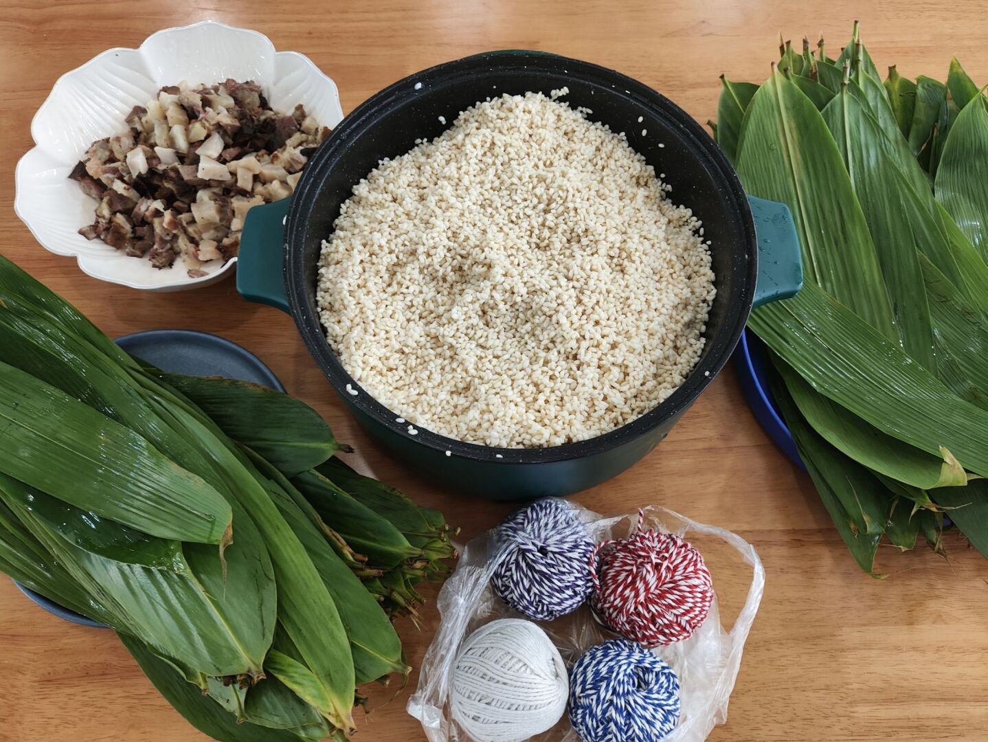“糯米需要提前浸泡多久?”“粽叶怎么才能清洗得干净又不破损?”面对同学们的疑问,田老师现场示范了备料的每个细节:浸泡两小时的糯米需沥干水分,加入酱油、盐、五香粉调味;新鲜箬竹叶需用温水轻柔刷洗,再煮至翠绿柔软以增加韧性。同学们分成小组协作,有人调配糯米馅料,有人整理粽叶棉线,有人负责工具消毒,有条不紊的准备工作让现场充满了烟火气与仪式感。