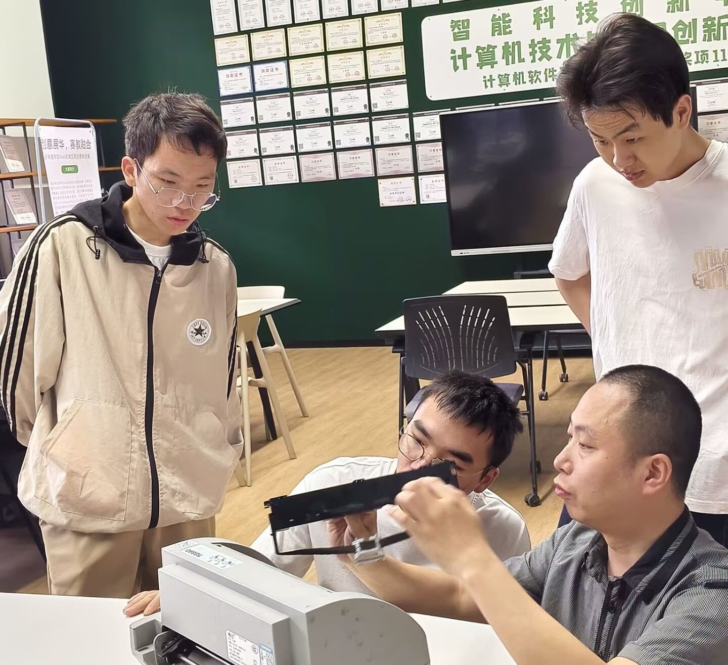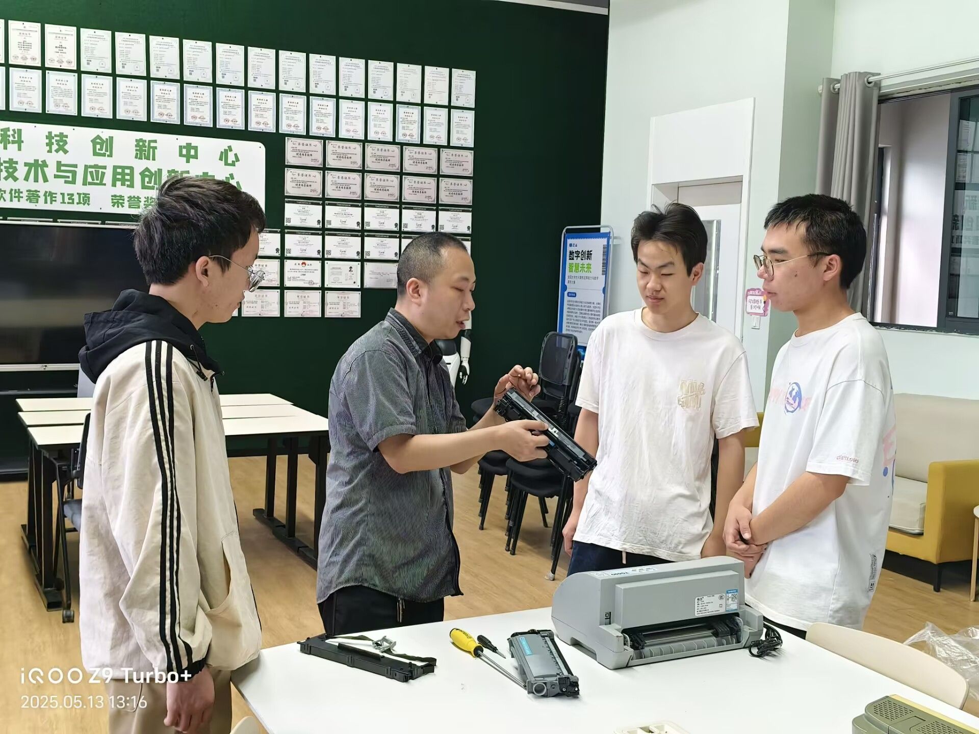 在数字化办公日益普及的当下,打印机作为重要的办公设备,其维护技能成为了学生们需要掌握的一项实用本领。2025年5月13日,在横山书院的创新中心工作室(朋辈交流室)里,一场别开生面的打印机维护实训课正在热烈进行,徐政老师担任主讲,李旎老师则手持相机,用镜头记录下这精彩的教学瞬间。