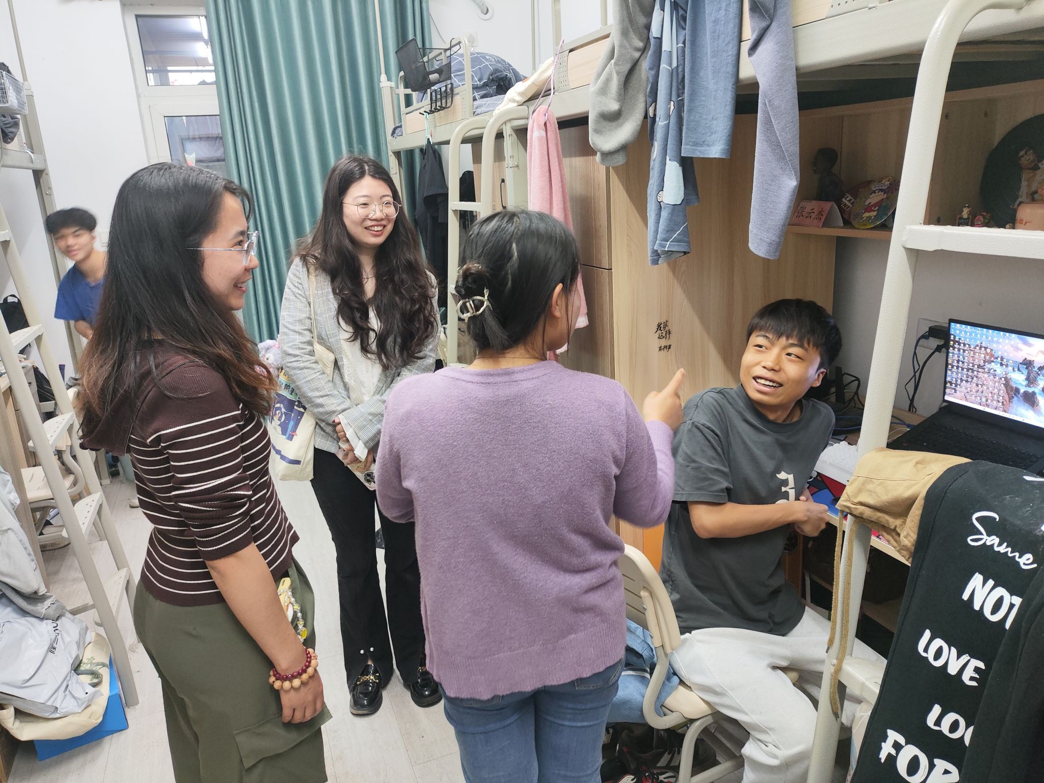 为营造安全、整洁、文明、和谐的宿舍环境,加强异科师生之间的交流互动,助力学生健康成长,2025年4月22日17:30,异科导师翁焰、游荟平与辅导员吴倩蓉老师携手走进古剑书院学生宿舍开展了查寝活动,以“唠家常”的方式倾听学生心声,将关怀融入生活点滴,用行动诠释“异科育人”的温度,以实际行动为学生的校园生活保驾护航。
