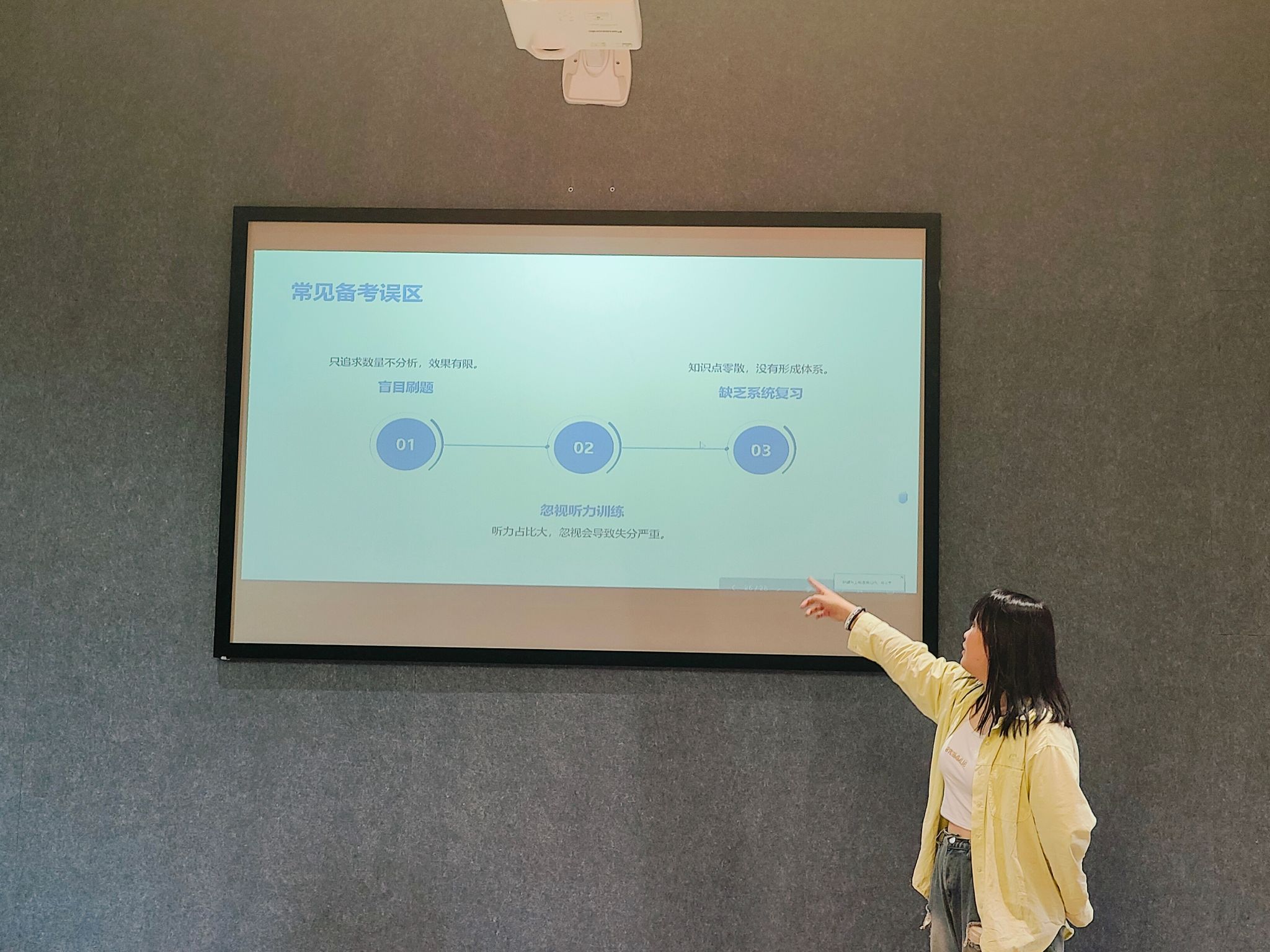 首先,由舒玉红老师为大家介绍本次活动的目的与意义,并鼓励学生大胆分享自己在英语四级备考过程中的难点、痛点以及优点。活动中,舒玉红老师谈到“对于我们每一位同学来说,英语四级考试不仅仅是一场考试,它更是我们大学学习生涯中的一次重要挑战,是我们迈向更广阔世界的一块敲门砖。通过这次活动,我们希望能够搭建一个平台,让同学们能够相互学习、相互借鉴,共同攻克英语四级备考中的重重难关。”