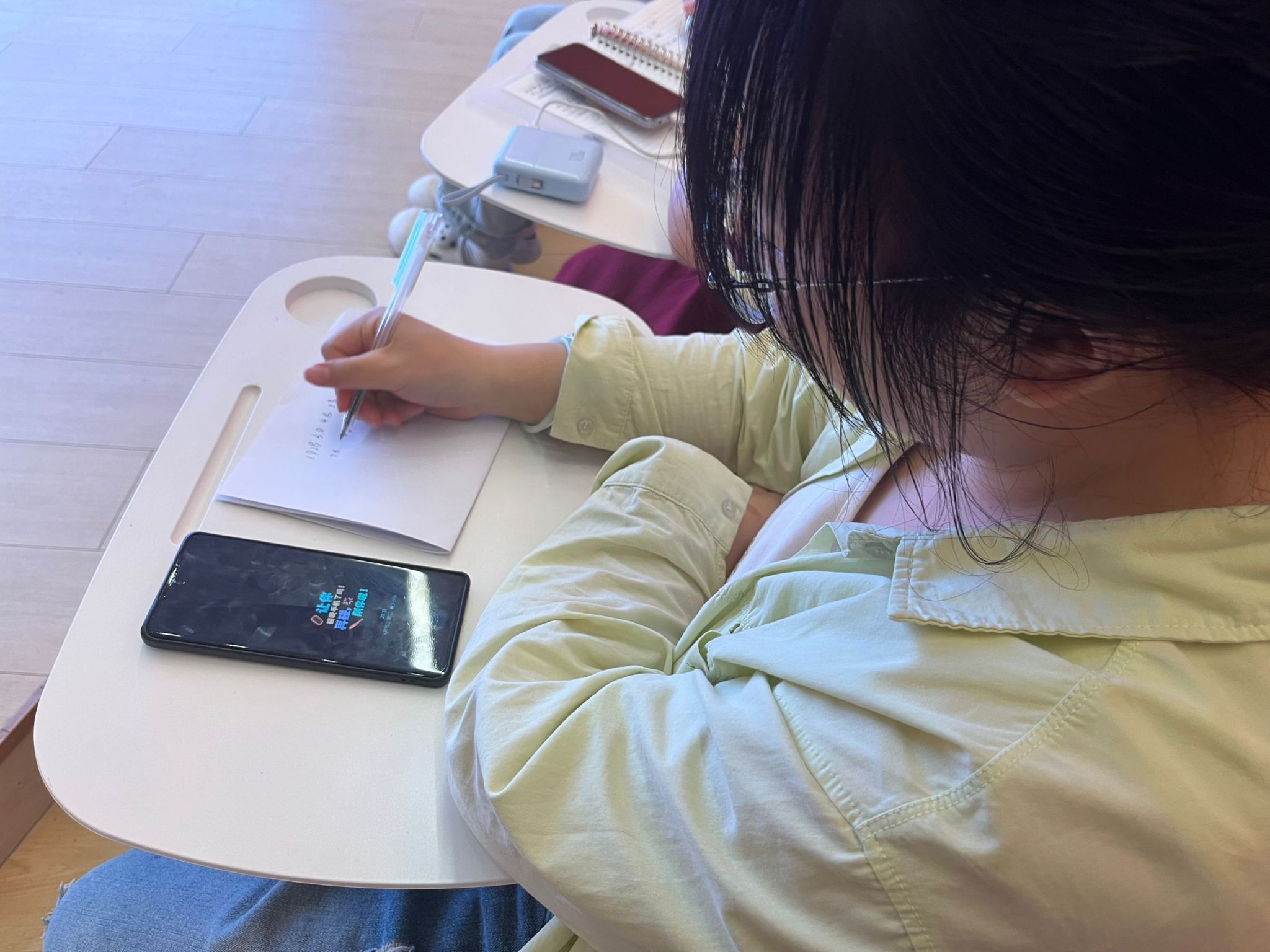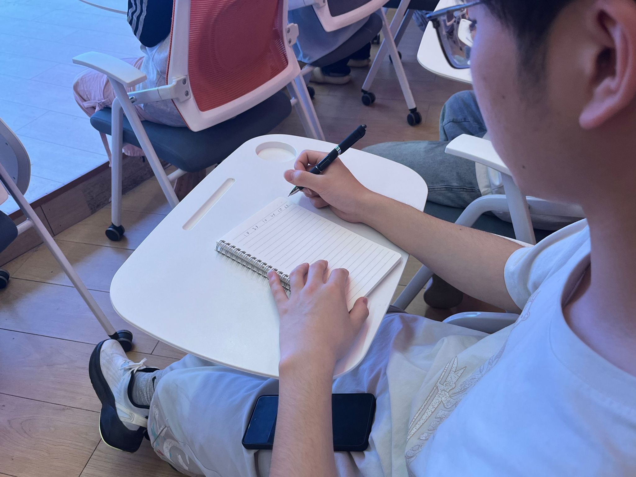 选手们在台下一边看题目,一边答题。他们时而蹙眉沉思,时而奋笔疾书。