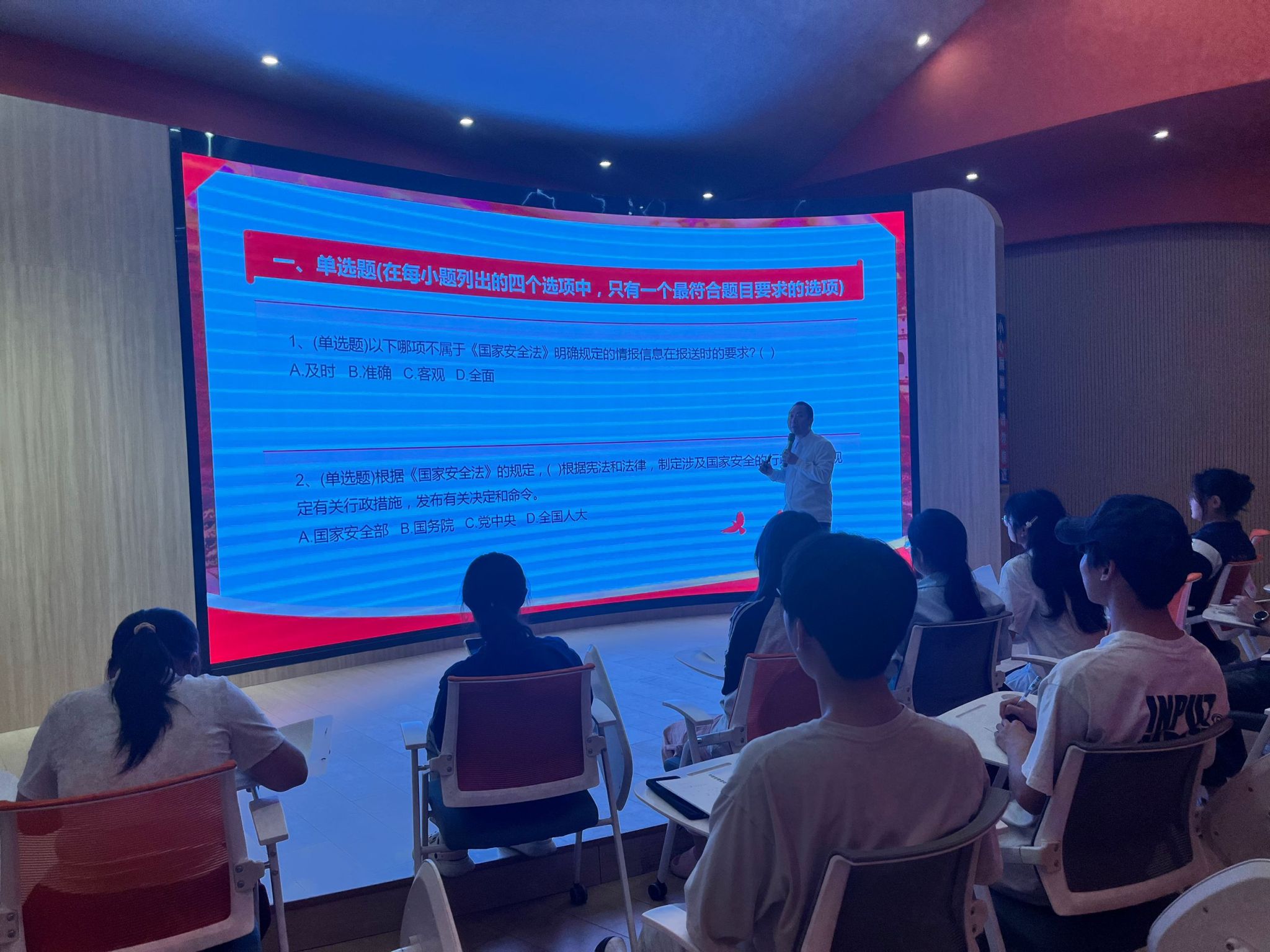 徐政老师走上主持台,开篇即引《孙子兵法》"上兵伐谋"之句,阐释"知识护国"的深层含义。接着徐老师使用PPT演示国家安全知识比赛的每道题目。涵盖科技安全、文化安全、国家安全法律法规等多方面的题目逐一呈现。