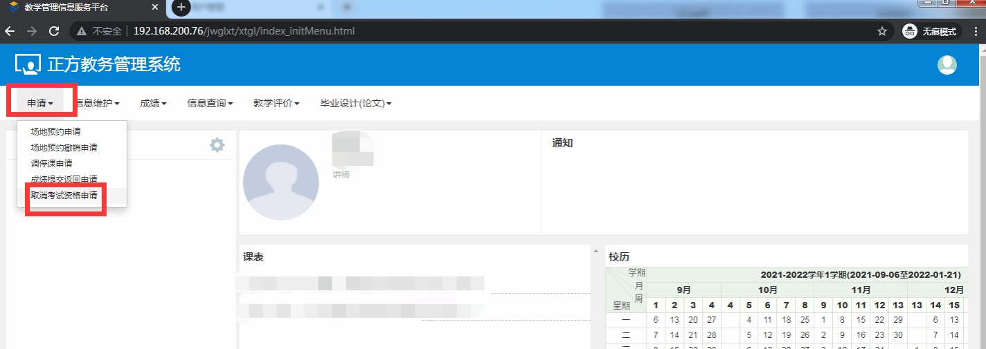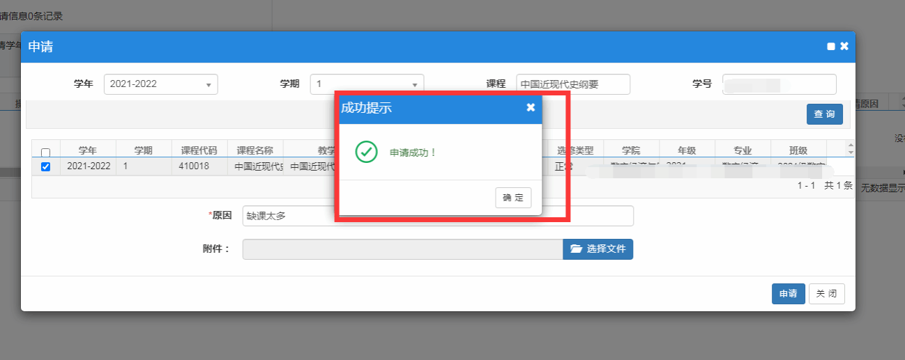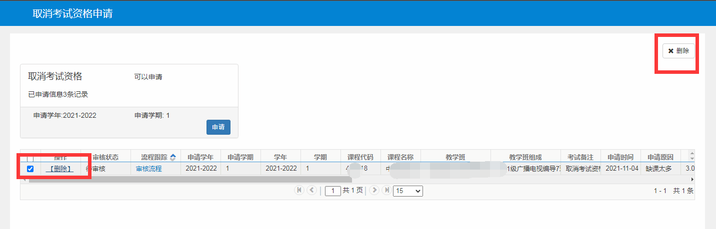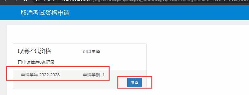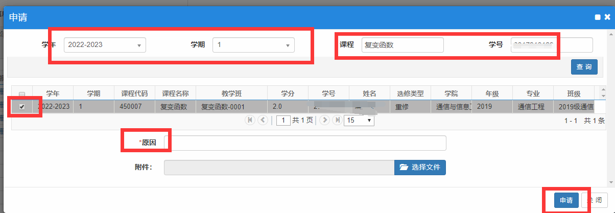 3.选择学年学期,按课程名称、学号进行查询,选中记录,在带*原因处录入取消考试资格的原因,点击申请。